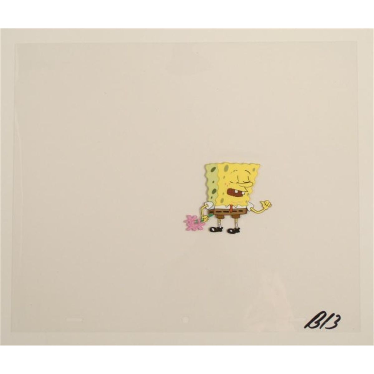 This original animation cel is from the Nickelodeon TV show SpongeBob Squarepants. The story takes place under the deep blue sea in Bikini Bottom, where SpongeBob resides. SpongeBob, who is a yellow, porous sponge, is your typical happy-go-lucky character, as he is always cheerful and enjoys making people laugh. Patrick Star, SpongeBob's neighbor who is a starfish, is your average children's show idiot, as he boasts knowing nothing and is often getting himself into ridiculous situations. Between the homes of these two lies the home of the miserable Squidward, a squid, who is known for being grouchy and playing tricks on SpongeBob and Patrick. Both SpongeBob and Squidward work at the Krusty Krab, a fast food business run by the greedy money-loving Mr. Krabs, a crab, the arch rival of the evil, possibly misunderstood, Plankton. Another neighbor, Sandy Cheeks, an athletic squirrel who normally wears an astronaut's space suit, was introduced in "Tea at the Treedome." She spends most of her time inventing and experimenting. * SpongeBob is pointing at himself * Original Production Animated Cel Overall Size of Cel: 10 1/2" x 12 1/2" Very Good ConditionThis is an original hand-painted cel set-up used in the production of an episode of "SpongeBob SquarePants." Each one-of-a-kind set-up represents a slight change in position of the characters. When individually photographed and projected in rapid succession, the images appear to move. * To create production cels, the original animator's drawing is transferred onto an acetate cel (by hand-inking and/or photo copying). The cel is then hand-painted on the reverse side. * The cel received by the winning bidder may be ever so slightly different from the one in the auction photos. * The cel is ready to be matted and framed. The animator's notations are at the bottom of the cel. There is some slight paint fade to SpongeBob's outline. * *