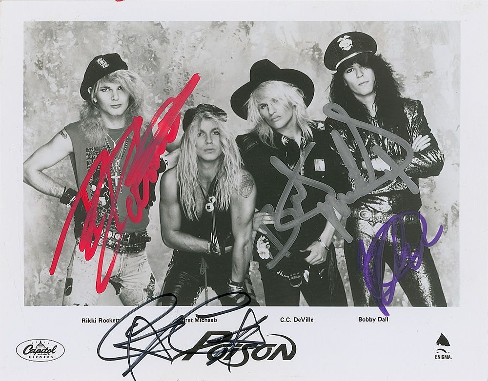 Glossy 10 x 8 Capitol Records publicity photo, signed in ink of various colors by Rikki Rockett, Bret Michaels, C. C. DeVille, and Bobby Dall. Some noticeable creasing to the left border, otherwise fine condition.