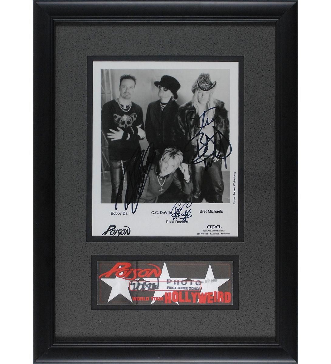 Satin-finish 8 x 10 group photo, signed in black felt tip by Rikki Rockett, Bret Michaels, C. C. DeVille, and Bobby Dall. Double-matted and framed with a Hollyweird photo tour pass to an overall size of 13.5 x 19. In fine condition.