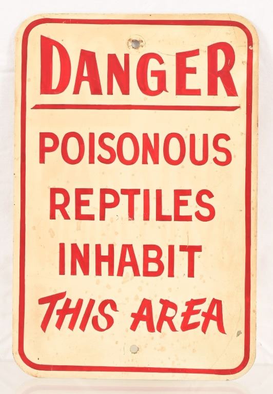 "Danger Poisonous Reptiles Inhabit This Area" painted tin sign. 12" x 18"