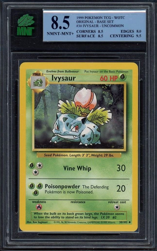 Vintage Ivysaur from the 1999 base set, graded 8.5 NM-MT+ by MNT Grading.
