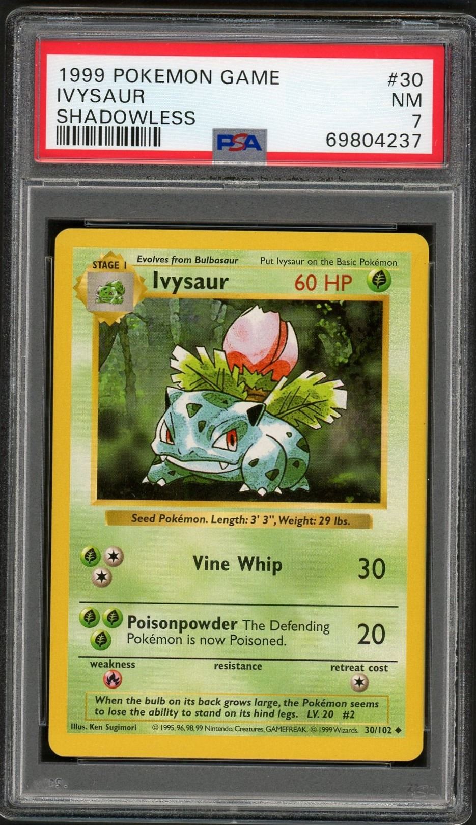 Nice vintage Ivysaur, from 1999 Shadowless, graded 7 NM by PSA.