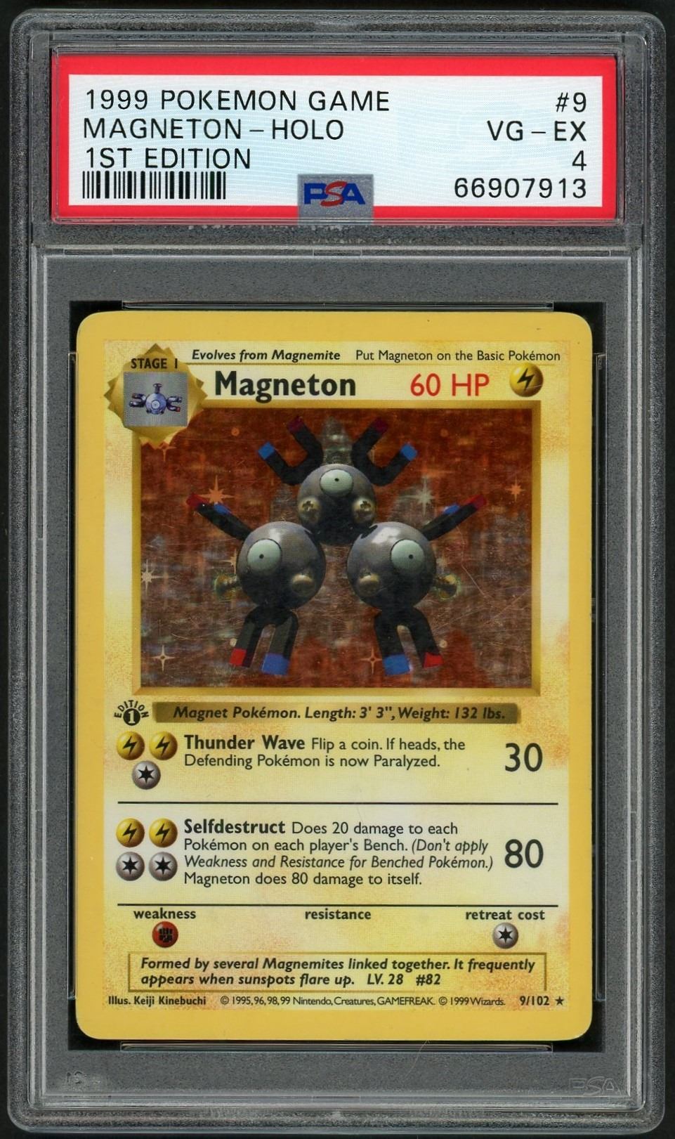 Nice mid-grade vintage Pokemon, from 1999, Magneton 1st edition hologram, graded 4 VG-EX by PSA.