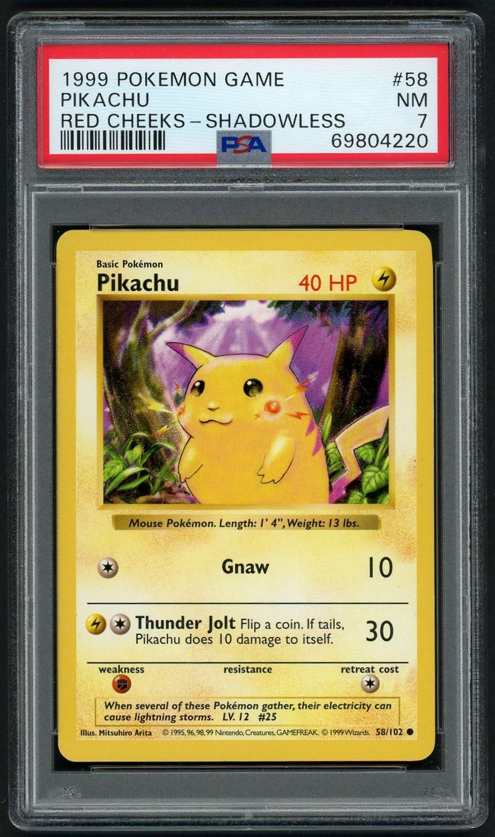 Superior vintage Pokemon, from 1999 Shadowless, Red Cheeks Pikachu, grading a nice NM 7 by PSA!