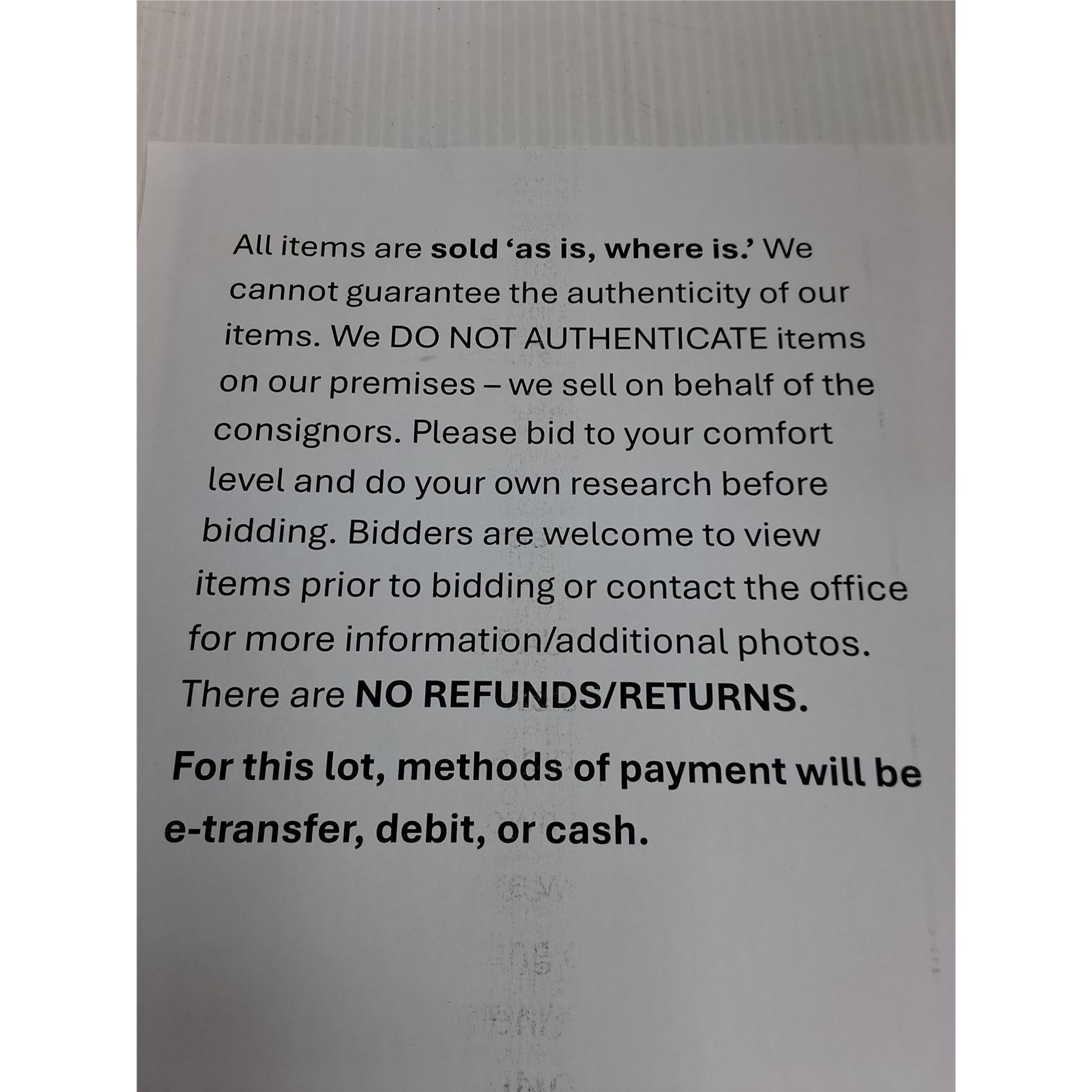 If you are wanting to hold on items for another auction coming up, let us know within 24 hours (maximum hold: 2 auctions). Please give 15 to 30 days for items to be collected, packed, payment processed and shipped out.