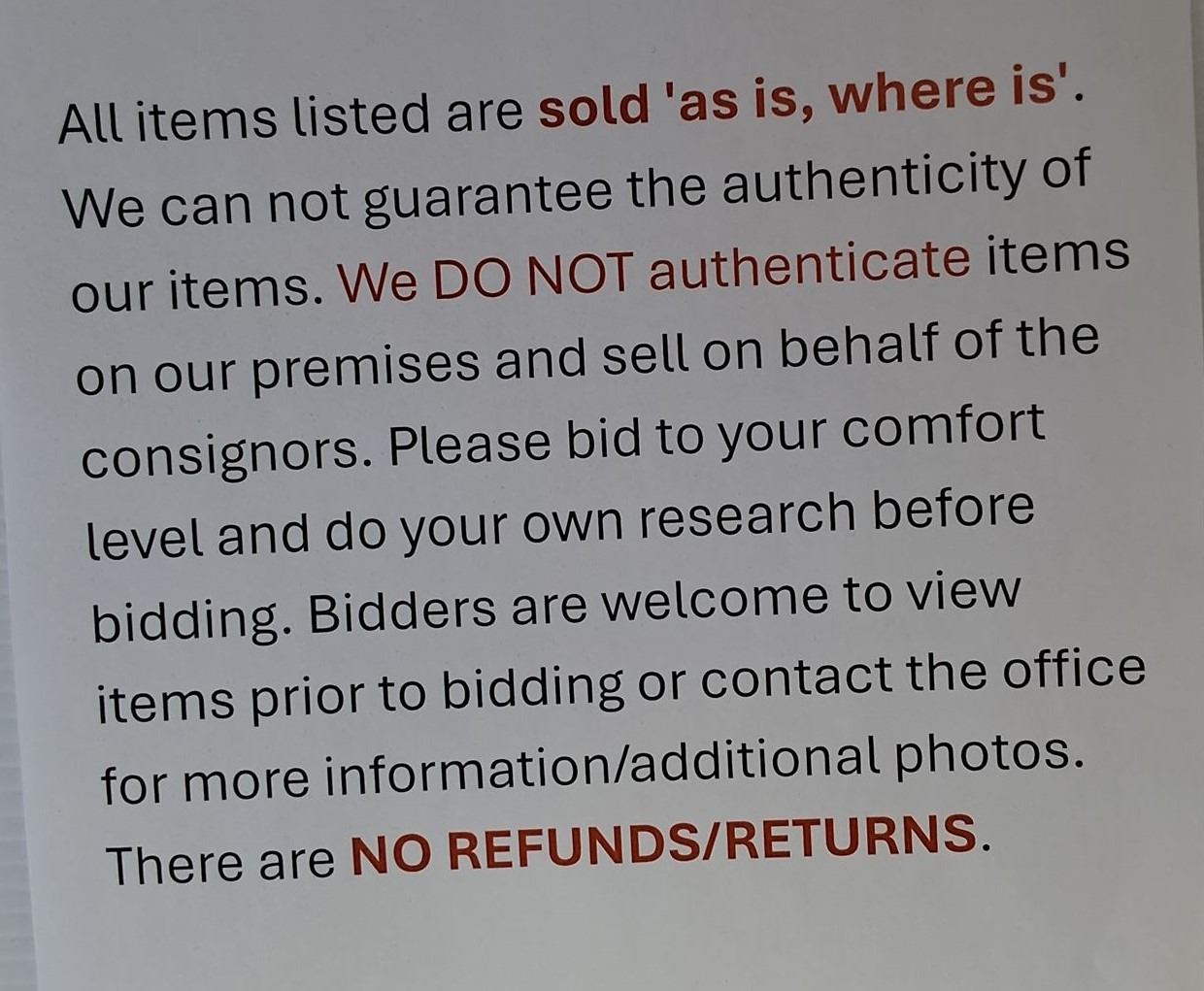 If you are wanting to hold on items for another auction coming up, let us know within 24 hours (maximum hold: 2 auctions). Please give 15 to 30 days for items to be collected, packed, payment processed and shipped out.