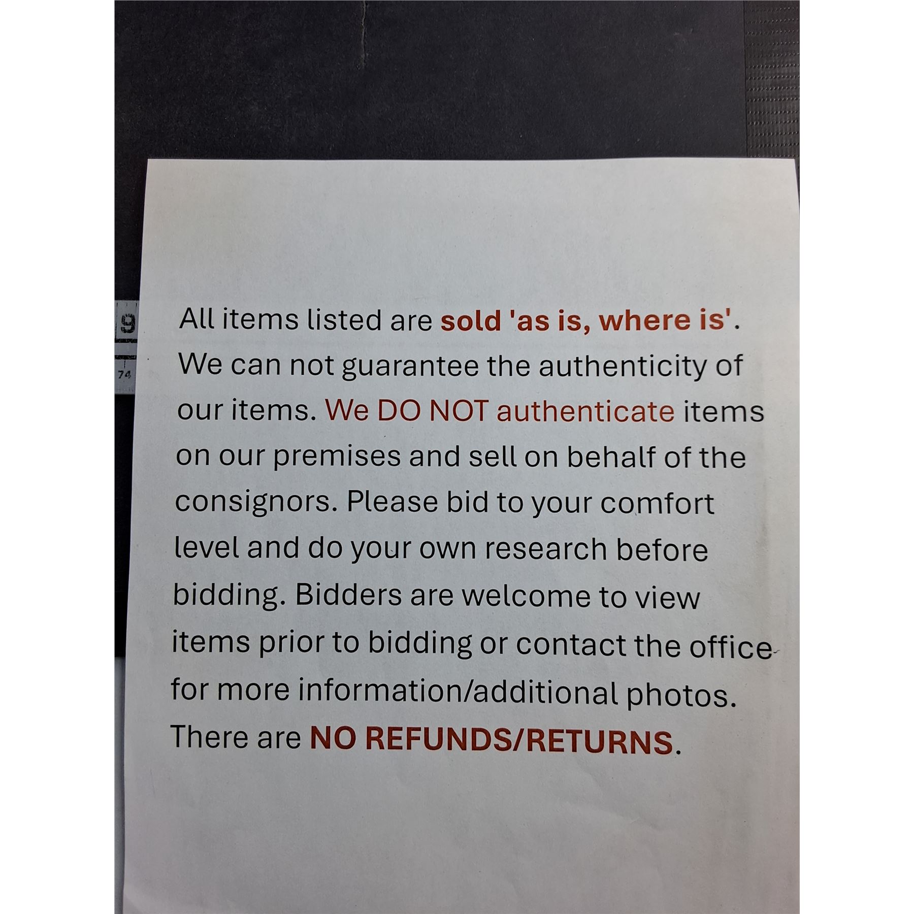 All items listed are sold 'as is, where is'. We cannot guarantee the authenticity of our items. We DO NOT authenticate items on our premises and sell on behalf of the consignors. Please bid to your comfort level and do your own research before bidding. Bidders are welcome to view items prior to bidding or contact the office for more information/additional photos. There are NO REFUNDS/RETURNS.