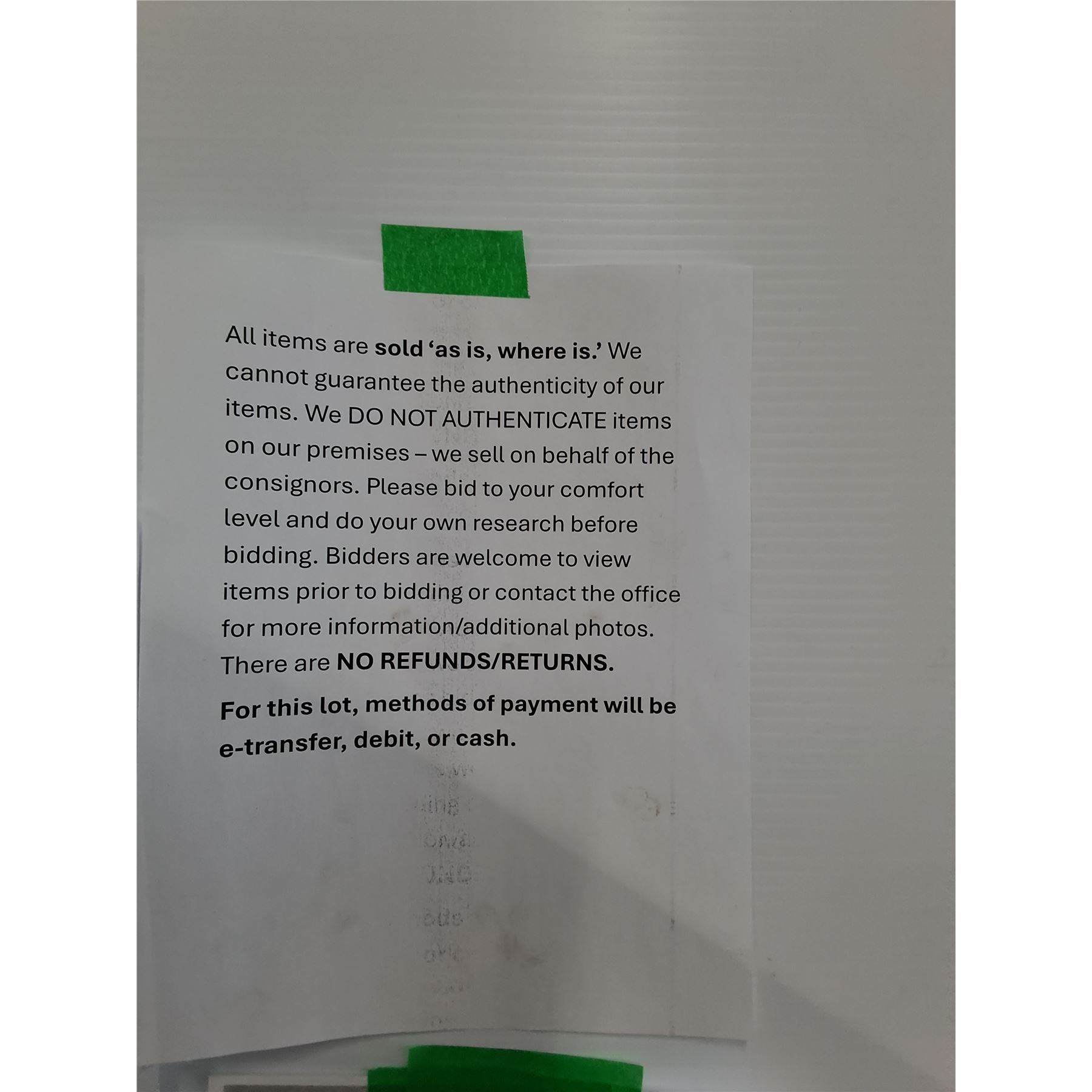 All purchases are bought AS IS, WHERE IS. No warranties or guarantees are applicable to any purchases.