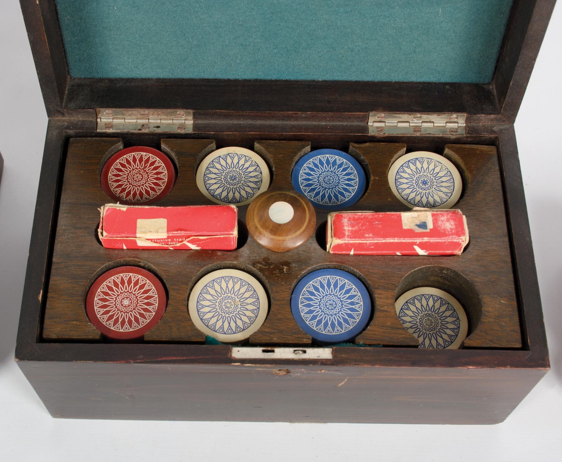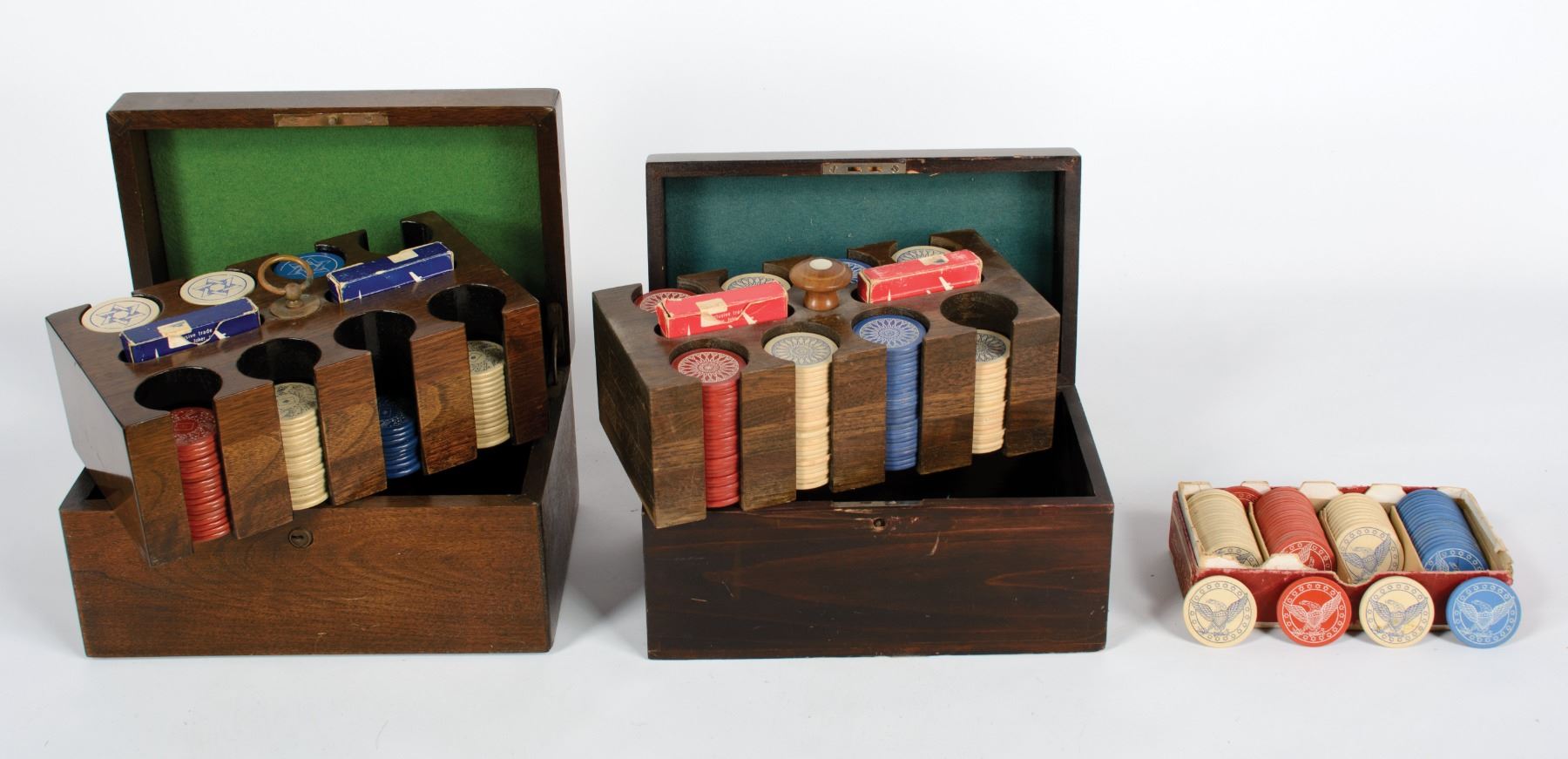 a) An eight-slot 200 chip rack with 115 "Evening Star" clay chips in red, white and blue. There are 54 "Spread Cards" chips also in red, white and blue. Two card slots. Rack sets into a lidded wood box, 10" x 6 1/2" x 5 1/2".