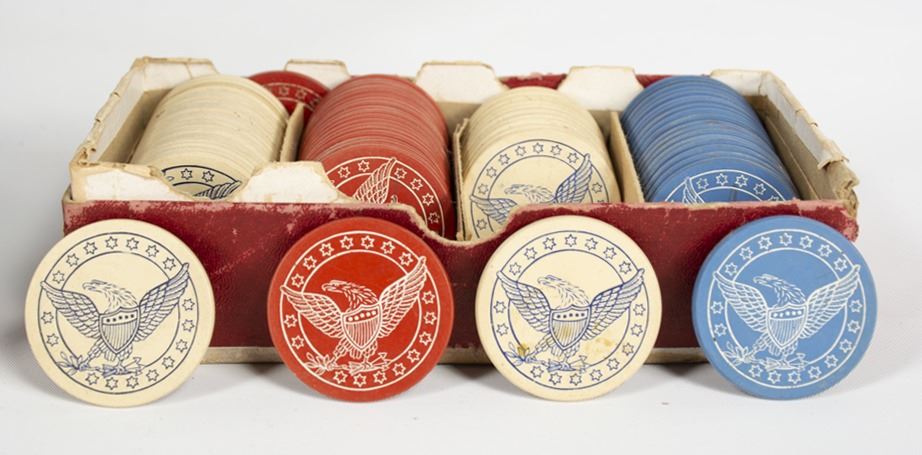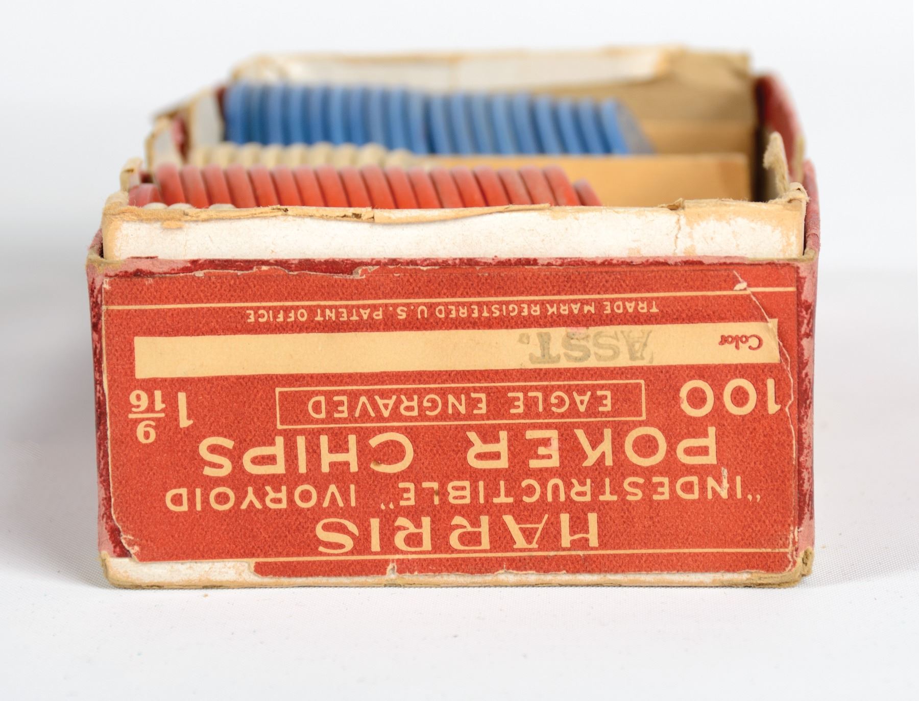c) A partial box of "Eagle Engraved" chips by Harris with the original correct label. The box contains 31 white, 20 red and 19 blue. Edges of the box are worn and separating.