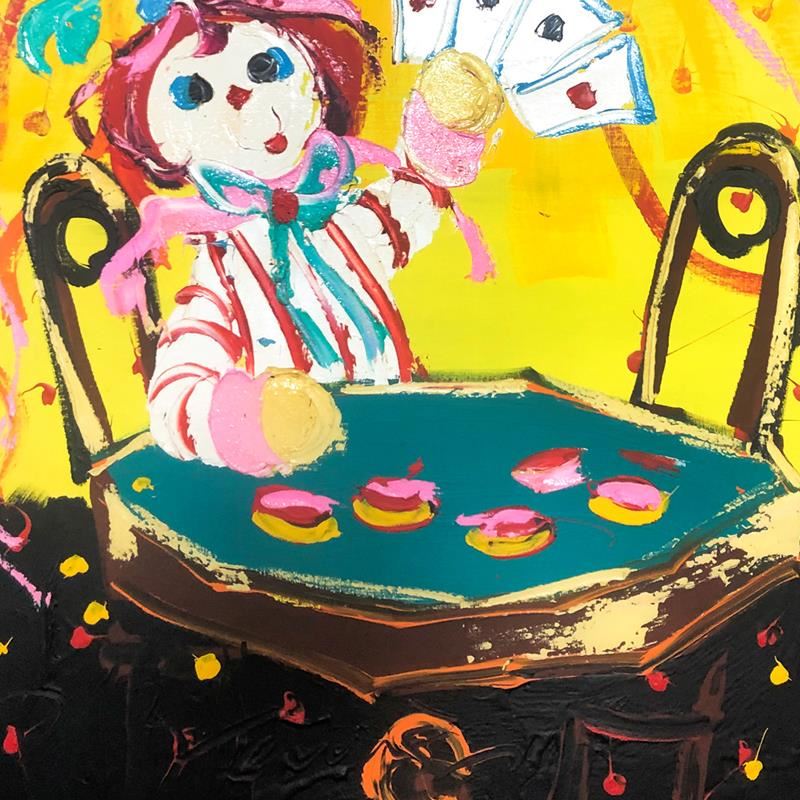 "Poker Face" is an original oil painting on stretched canvas by Paul Blaine Henrie (1932-1999). The piece is hand signed by the artist and comes with a letter of authenticity. Please note that due to the age of this piece and the way it was stored, there
