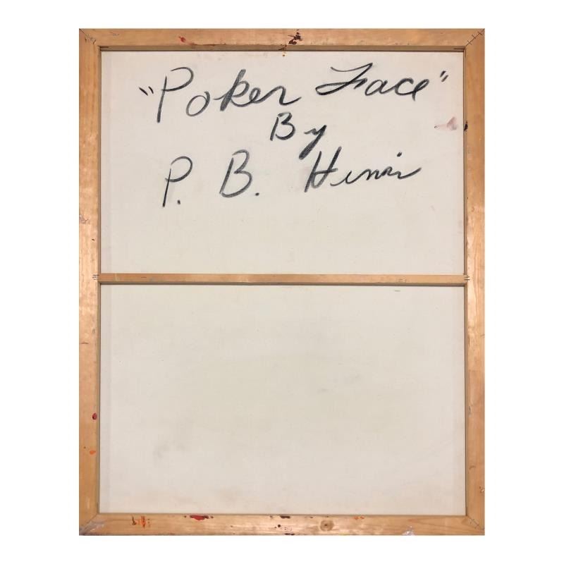 "Poker Face" is an original oil painting on stretched canvas by Paul Blaine Henrie (1932-1999). The piece is hand signed by the artist and comes with a letter of authenticity. Please note that due to the age of this piece and the way it was stored, there