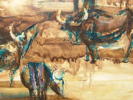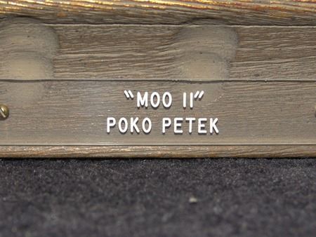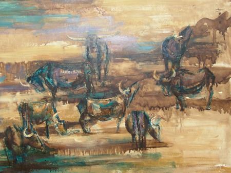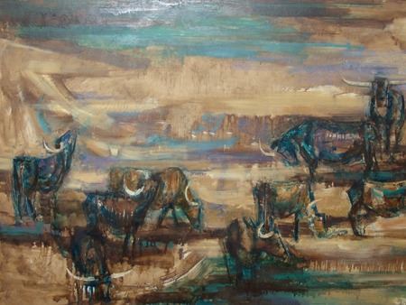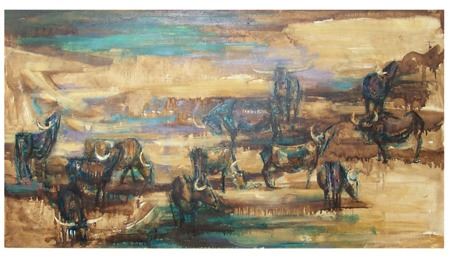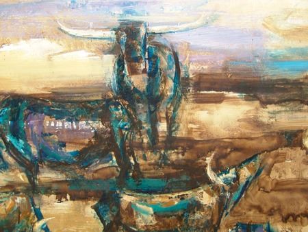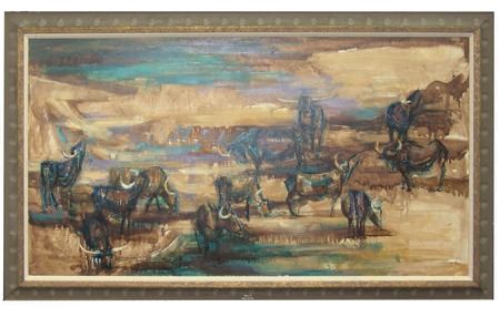 Mid 1900s, Colorful and large signed original oil on canvas depicting cattle out on the range - "MOO II." Very good condition. Artist also known as Beverly Jane Petek. 25-1/2" x 47-1/2" (31-1/4" x 53-1/4" framed