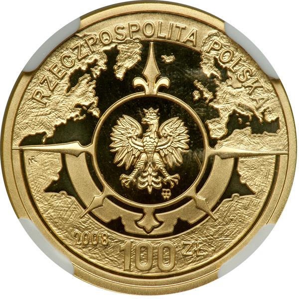 Poland. 100 Zlotych, 2008. KM-Y657. 400th Anniversary - Polish Settlement in North America. NGC graded Proof 69 Ultra Cameo.
