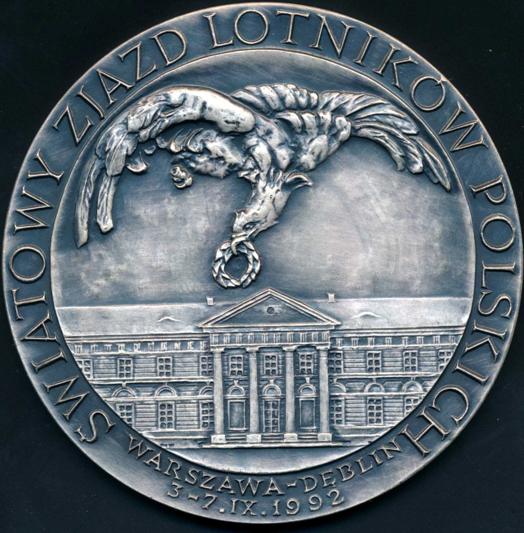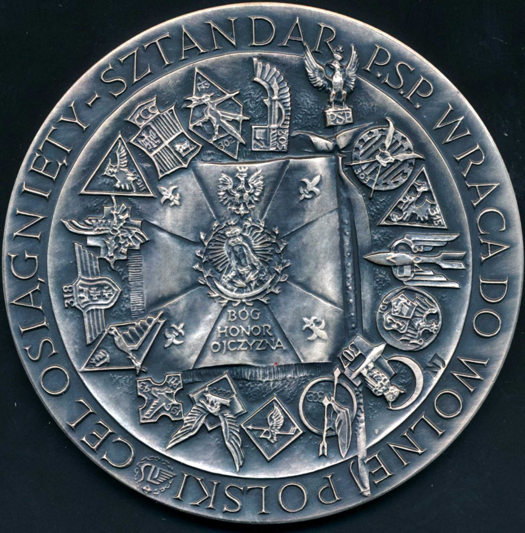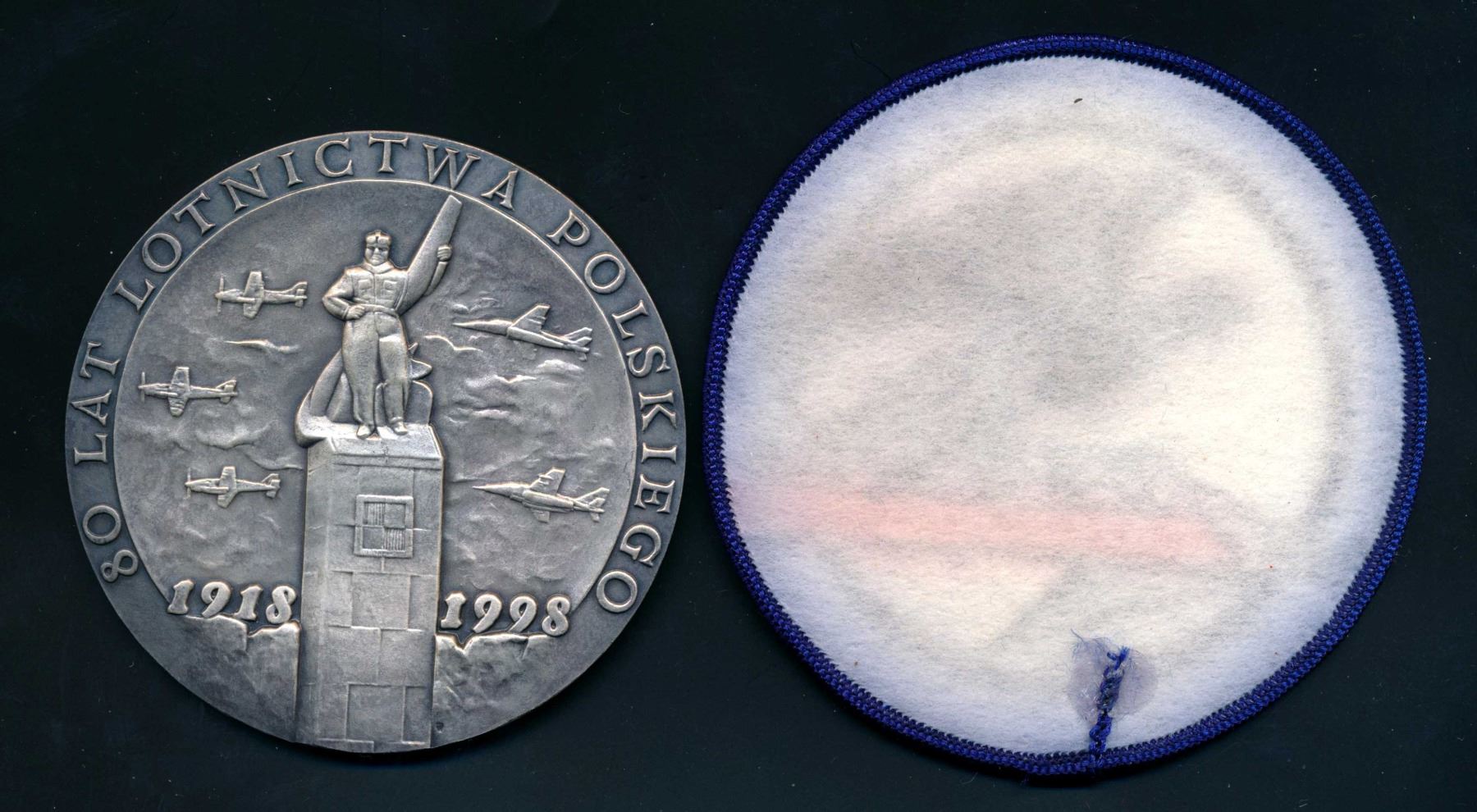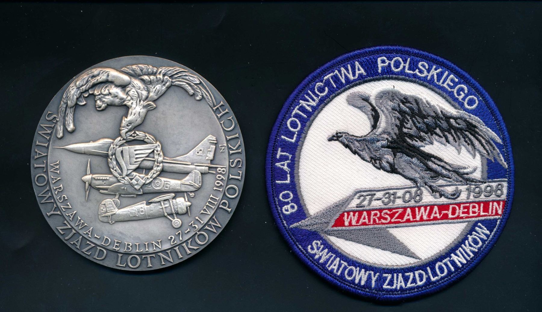 1 x 1998 AE-80 silver plated Medal with fitted box and 95 mm Swiss Embroidered patch commemorating the Polish Airforce 163.87 gms. , 1992 Polish Avaition Congress AE-80 silver-plated in original box. 159.7 gms., 1 x 1983 40th.Anniversary commemorating the Jewish heros in the Warsaw Ghetto.AE-79 129.0 gms., 1 x 50th. Anniversary of the Protection of Poland by the Partisans led by Major Henryk Hubal. AE-79 126.98 gms.