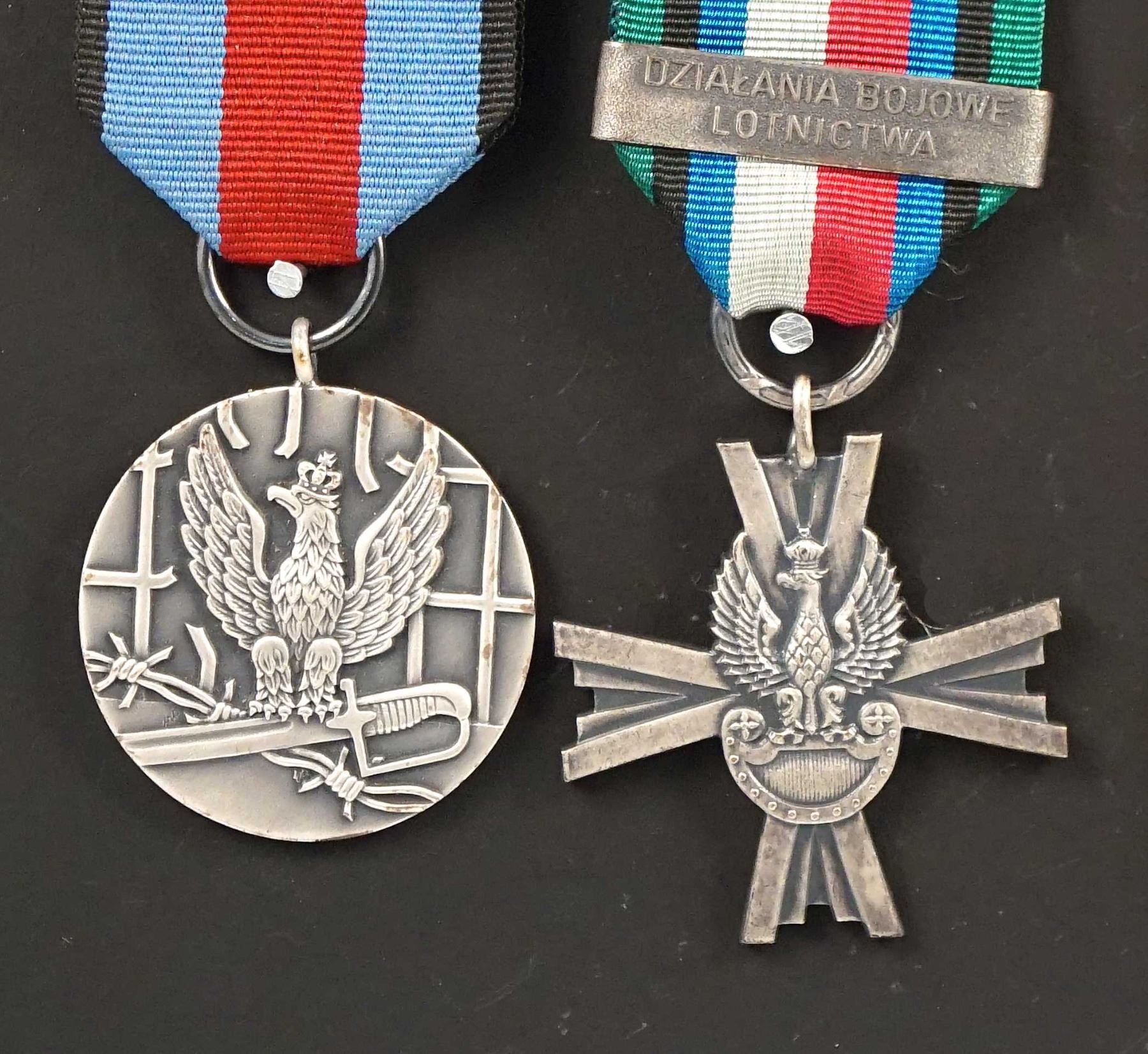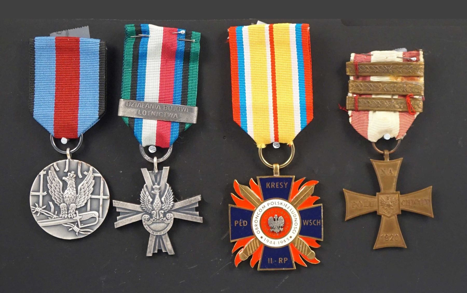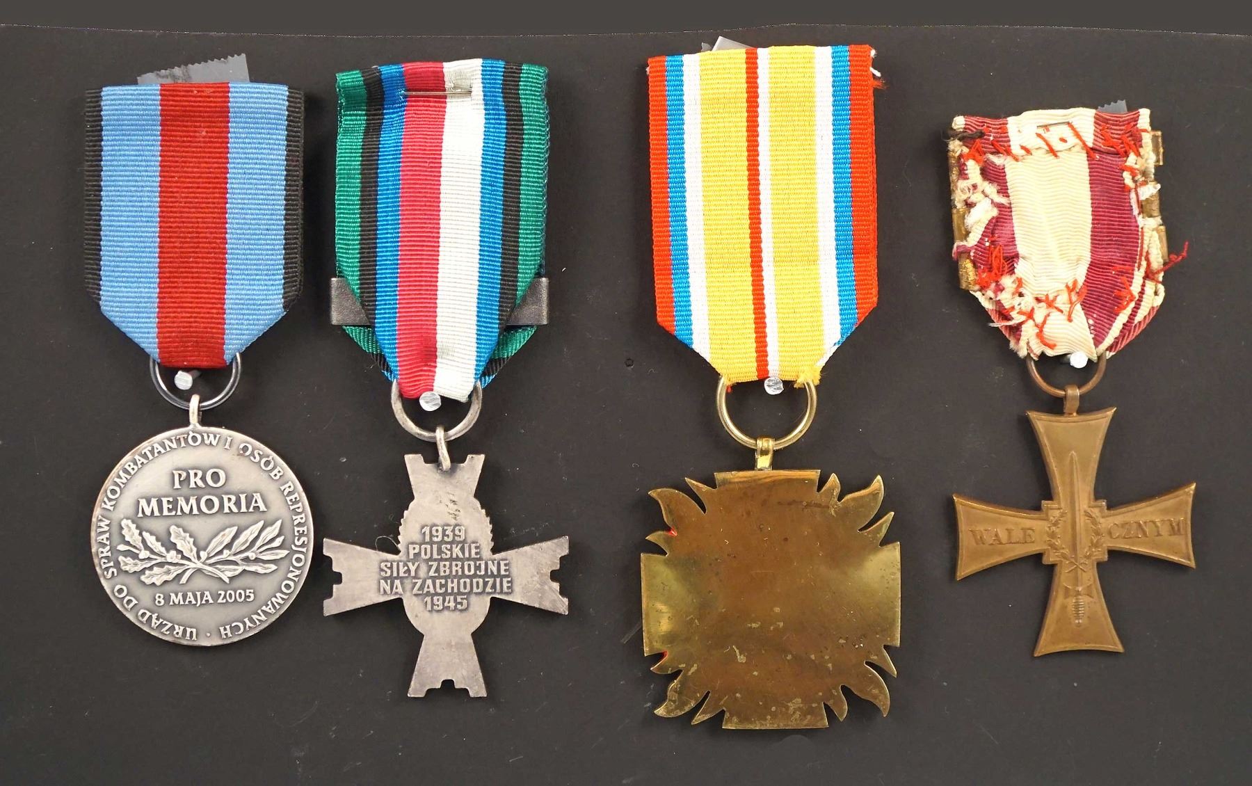1 x 1920 Cross of Valour w/3 gold bars in red box VF, 1 x Defenders of the Polish Population 1944-45 with ribbon UNC, 1 x 2005 Pro Memoria Medal w/ ribbon UNC, and 1 x Polish Military Cross w/ Air Operations bar. UNC