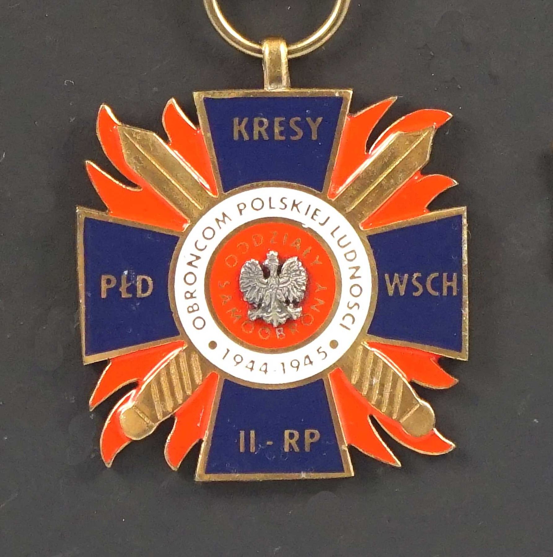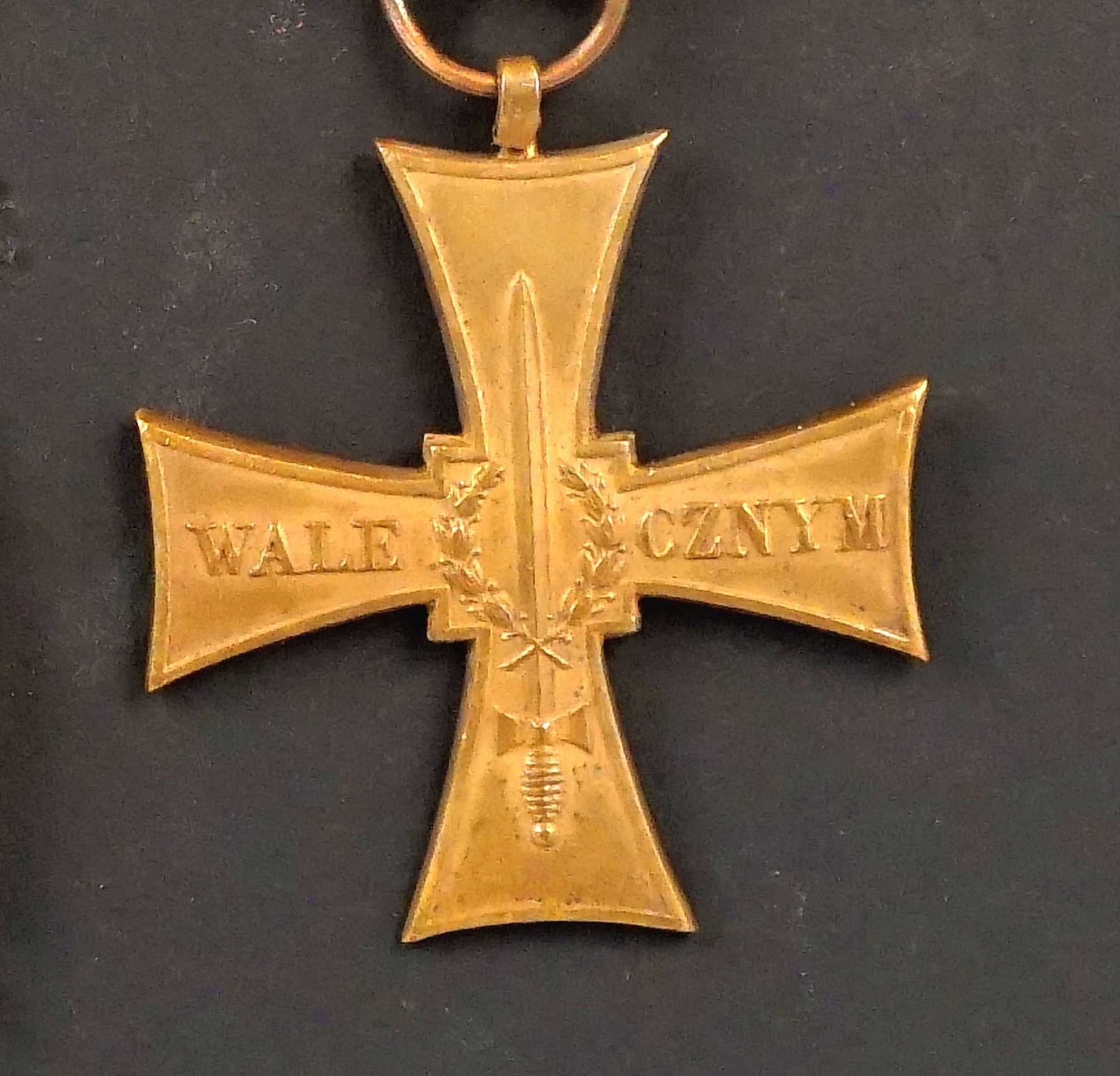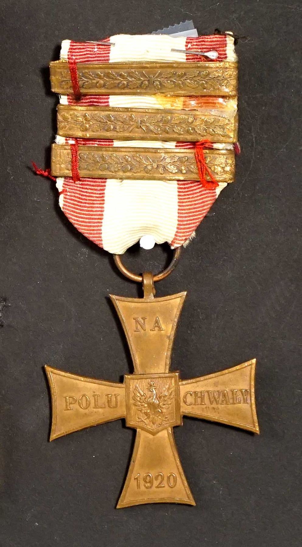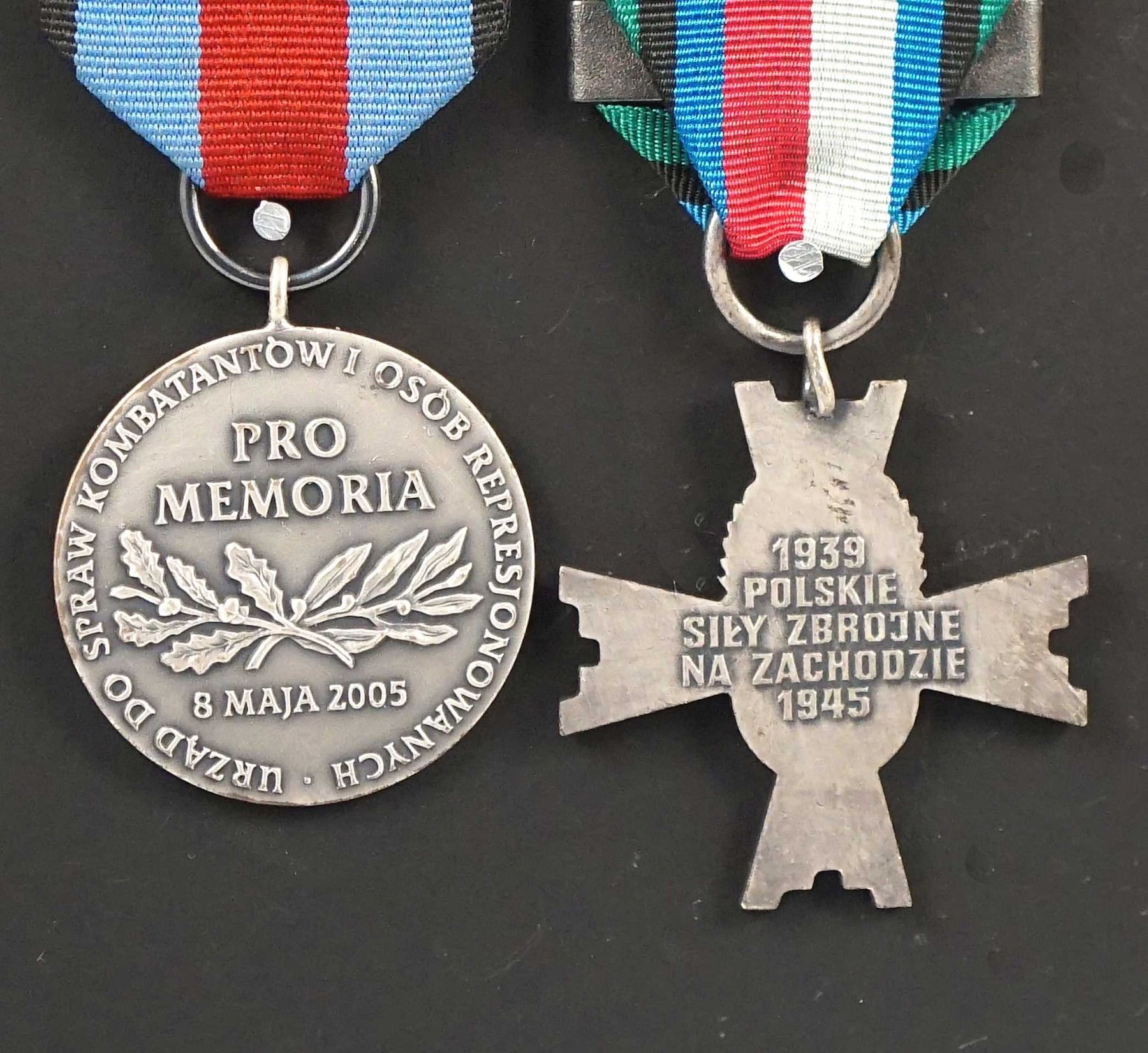 1 x 1920 Cross of Valour w/3 gold bars in red box VF, 1 x Defenders of the Polish Population 1944-45 with ribbon UNC, 1 x 2005 Pro Memoria Medal w/ ribbon UNC, and 1 x Polish Military Cross w/ Air Operations bar. UNC