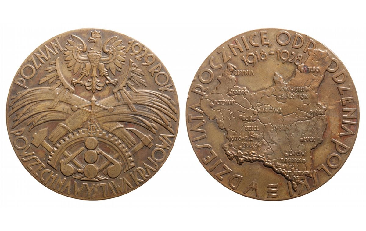 630. Unification medal, map of Poland 1918-1928, symbols of industry & agriculture, 50mm, Bronze. Extremely Fine, toned. RARE.
