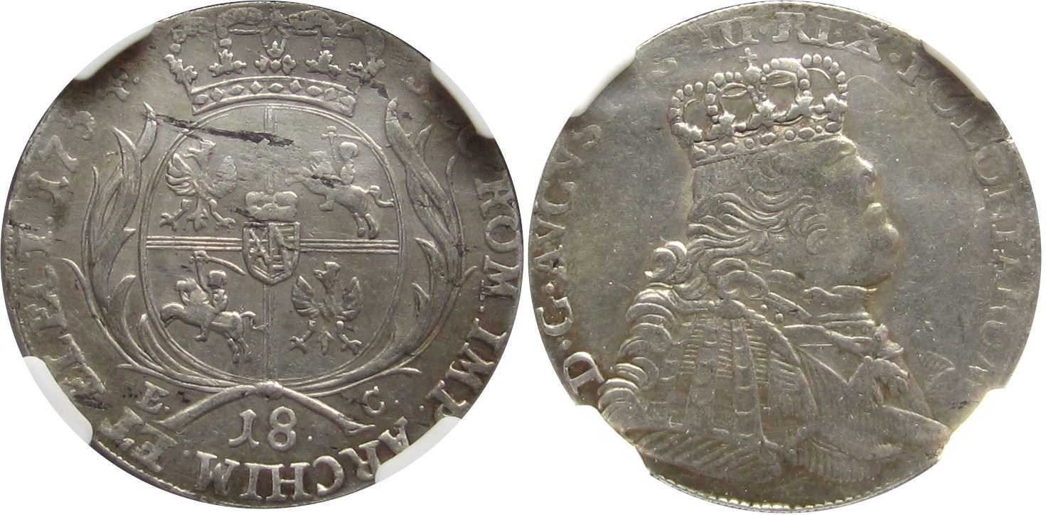 Poland;  August III 18 Groszy 1754-EC NGC XF Details, designated as cleaned. Leipzig mint, KM148.2.  Nice issue showing just some light hairlining with remaining lustre.