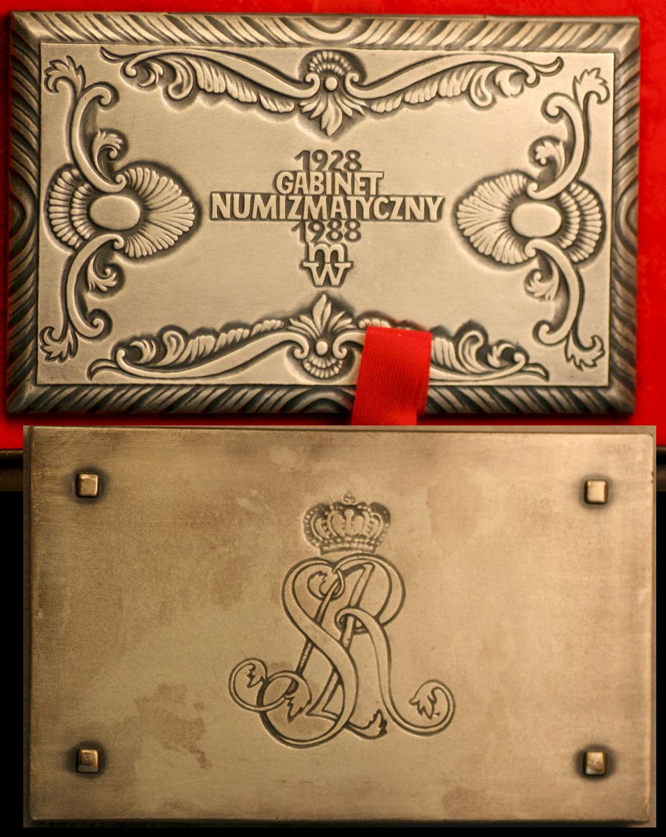 Poland - Commerative Medal, RARE. This is a unique commemorative medal which consists of a Antiqued silver plated tombac case (made in 1988) 92x58x11mm. On the inside of the lid is an ingraving of the street where the first mint was located in 1766 (based on an 18th century painting). Inside the case, there is a set of coins from the times of Stanislas August Poniatowski, the founder of the Warsaw Mint. Gold ducat with the King’s initial,silver thaler with the King’s portrait and copper grosz with the coat of arms of Poland. The bottom of the case is decorated with the King’s initials SAR (Stanislas August Rex) under the crown. We believe the coins are reproductions as they are fixed in place and the information sheet enclosed notes that “the originals of all coins were designed by Jan Filip Holzheausser, court medalist of Stanislas as well as the medalist of the Warsaw Mint. Only 300 medals were made.
