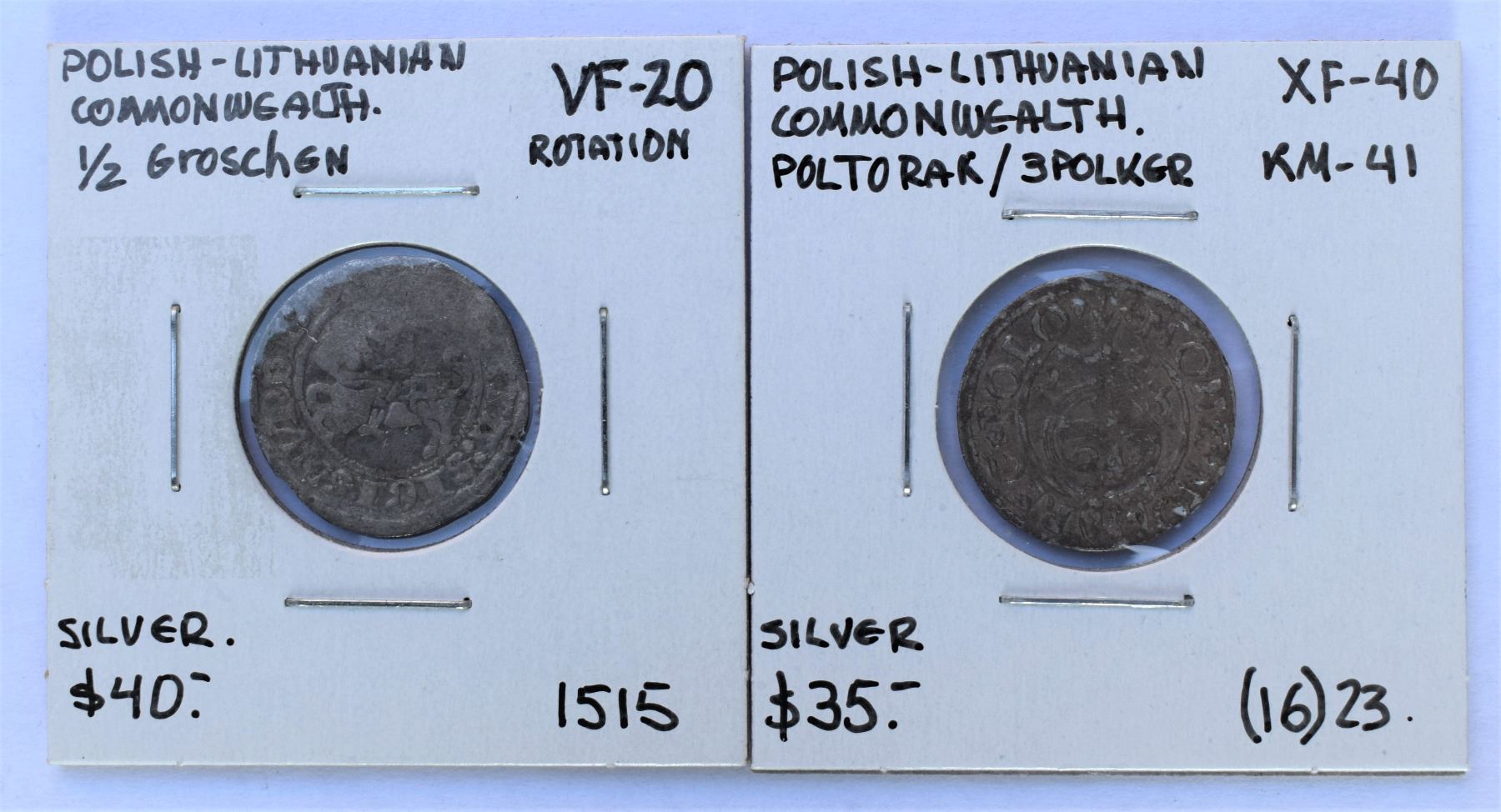 Poland, (Lithuanian Commonwealh) ½ Groschen 1515 & 1 Poltorak 16(23) Silver VF-XF
