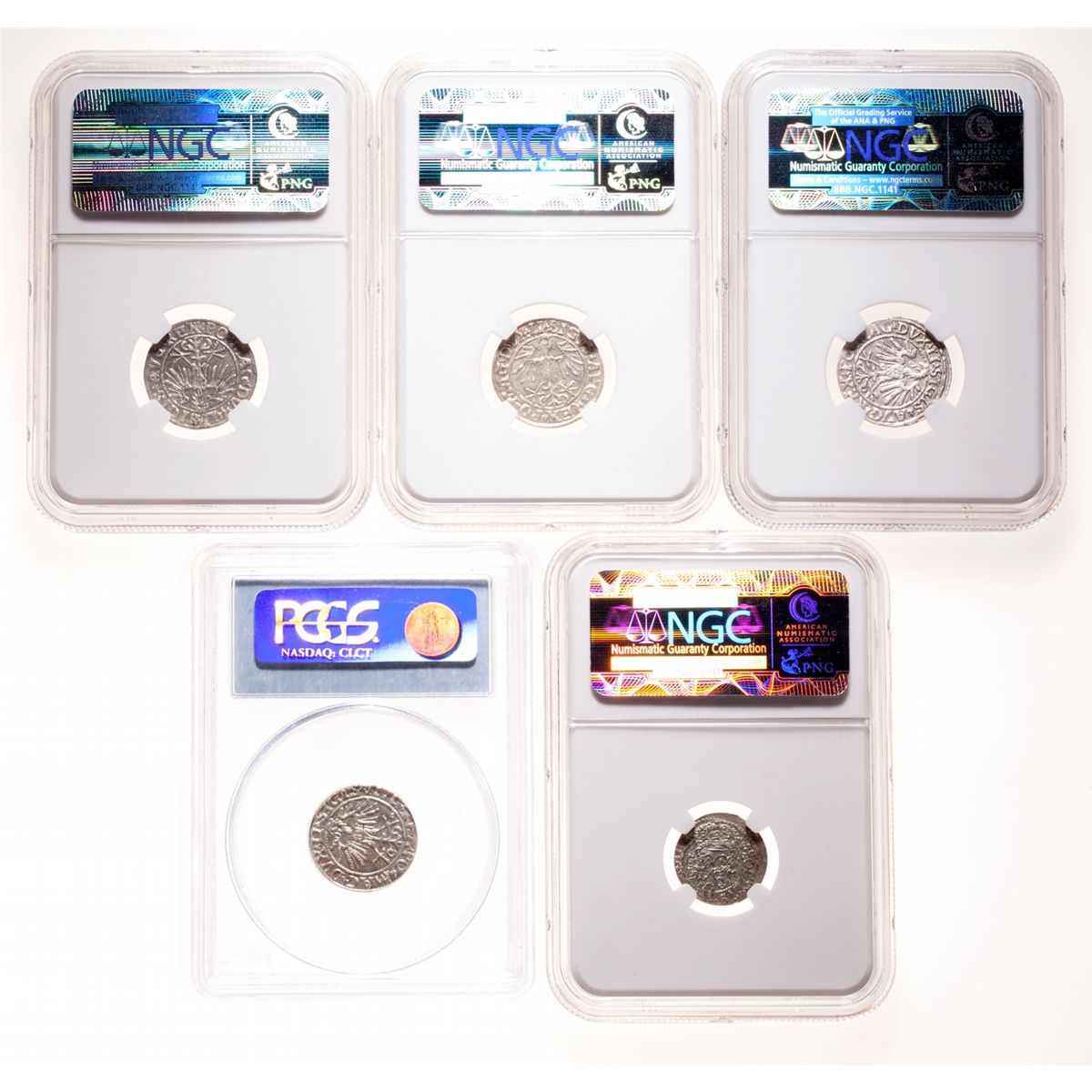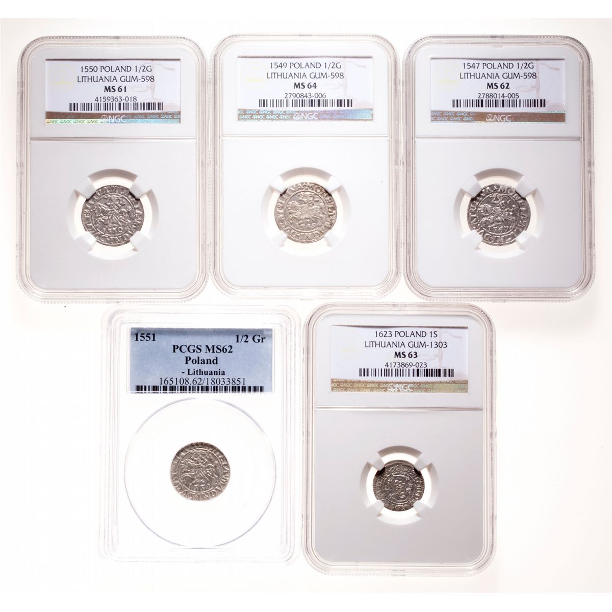 Poland. Lot of five (5) Lithuanian silver coins, including: 1 Shilling 1623, Gum-1303, NGC MS-63; 1/2 Grosz 1549, Gum 598, NGC MS-63; 1/2 Grosz 1547, Gum 598, NGC MS-62; 1/2 Grosz 1550, Gum 598, NGC MS-61; 1/2 Grosz 1551, PCGS MS-62.