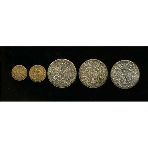 <B>Mixed gold and silver set as follows:</B></I> silver coins: (3) 100 Zlotych 1966, KM-Y57, and (2) Proba, KMPr146, and KM-Pr148; and gold coins 10 and 20 Zlotych 1925, KM-Y32 and Y33. All are UNC. The set comes in a custom case produced by a Polish merchandiser.<BR><BR><b>Shipping:</b> Coins & Currency (<a target="_blank" href="http://www.heritageauctions.com/common/shipping.php">view shipping information</a>)