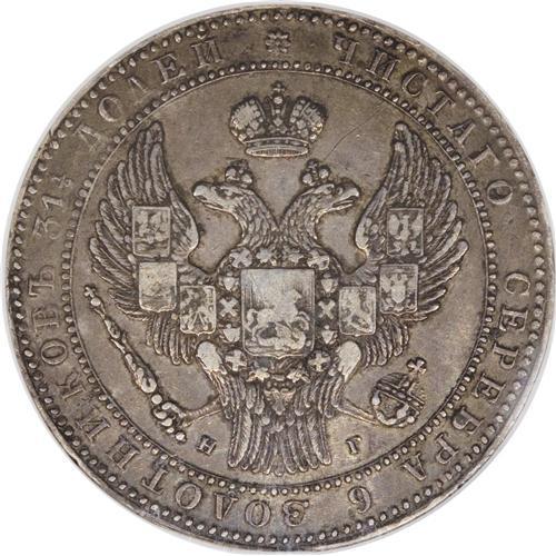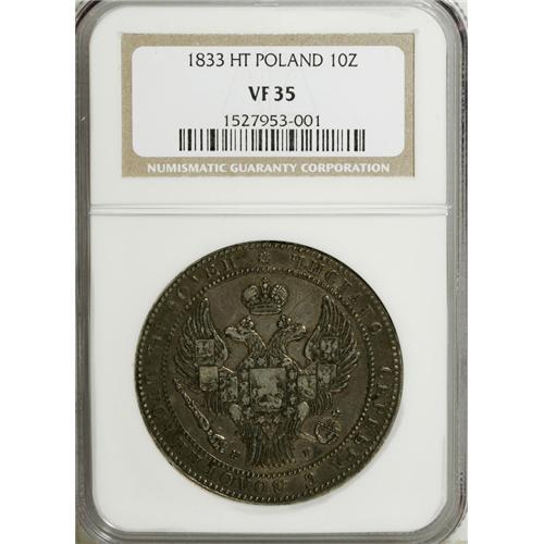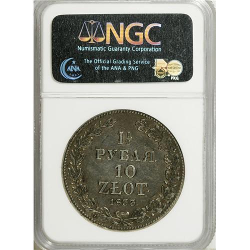 <B>Nicholas I. 10 Zlotych-1-1/2 Roubles 1833-H?,</B></I> Broad Crown, Bit-1083, Uzd-4096, Kop. 9440 R1, KM-C134, VF35 NGC. Medium gray patina with light to moderate abrasions.<BR><BR><b>Shipping:</b> Coins & Currency (<a target="_blank" href="http://www.heritageauctions.com/common/shipping.php">view shipping information</a>)