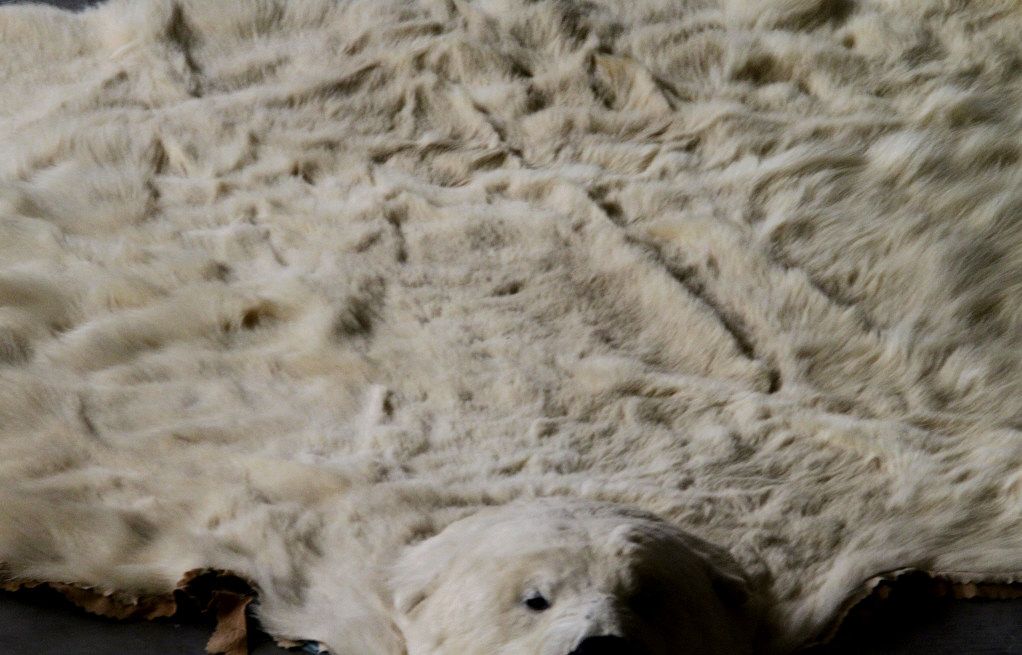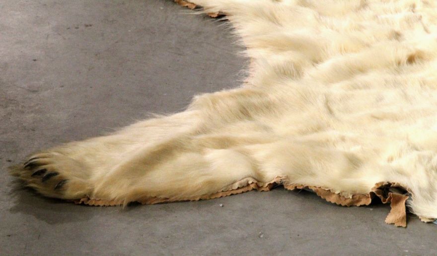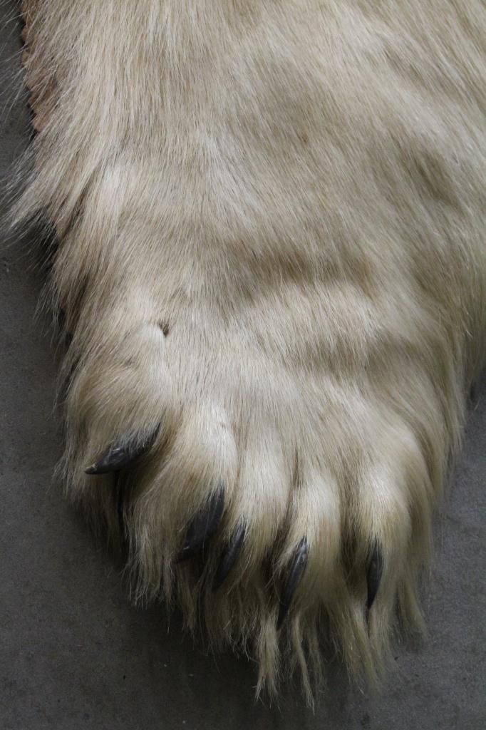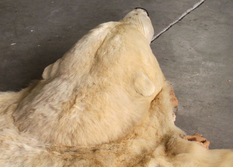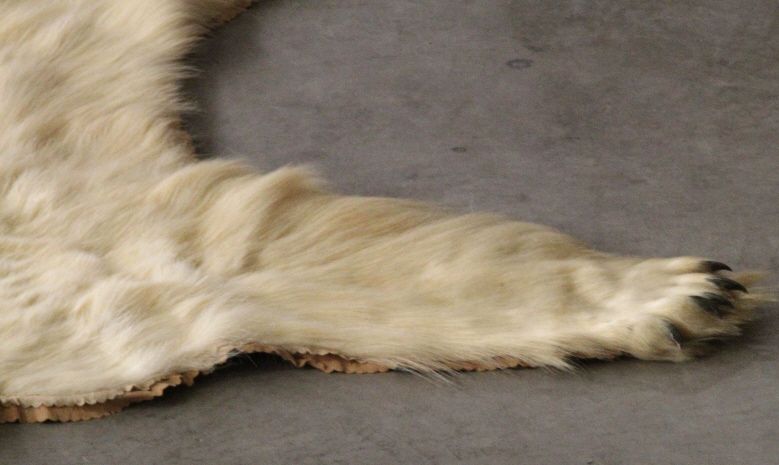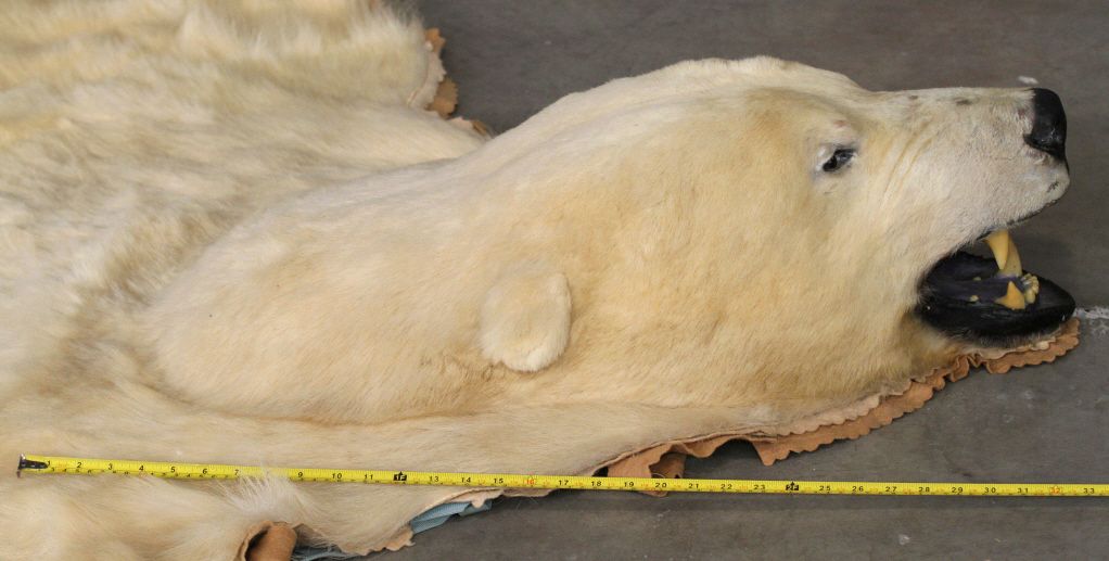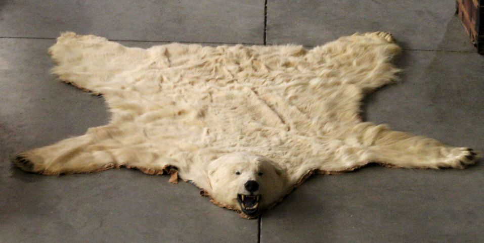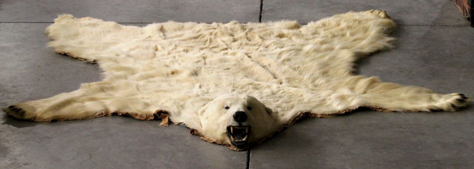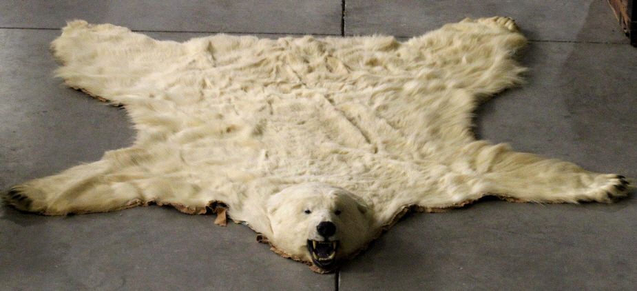 Polar Bear Rug by Jonas Brothers This is a Trophy Polar Bear which was don by the Jonas Brothers and was Shot by Edgar J. Foss in 1969 at Cape Hope, Alaska. Attached is the story of how this bear was killed and of the Hunter. In summary the hunter, Edgar J. Foss a WWI B-24 Pilot, War Hero, and Newspaper Editor, and the guide were told to find out this wild polar bear which had killed an Eskimo man. They Flew over him and after failing to find him turned back towards their plane and in between them was this giant Polar Bear, he charged and the guide video taped not allowing Egar to shoot finally once he was almost on top them Edgar shot and dropped the bear within 20 yards. This Bear Comes with the kill sire pictures, skull, and this authentic piece of history. Measures from Front Paw to Front Paw is 113", from the Nose to the Back of the Paw is 118", from the Front to the opposite Back Paw is 132", Back Paw is 19", Front Paw is 10" wide at the claws, head on rug is 34" long, skull 17.5" with over 2" front tooth.