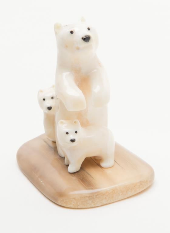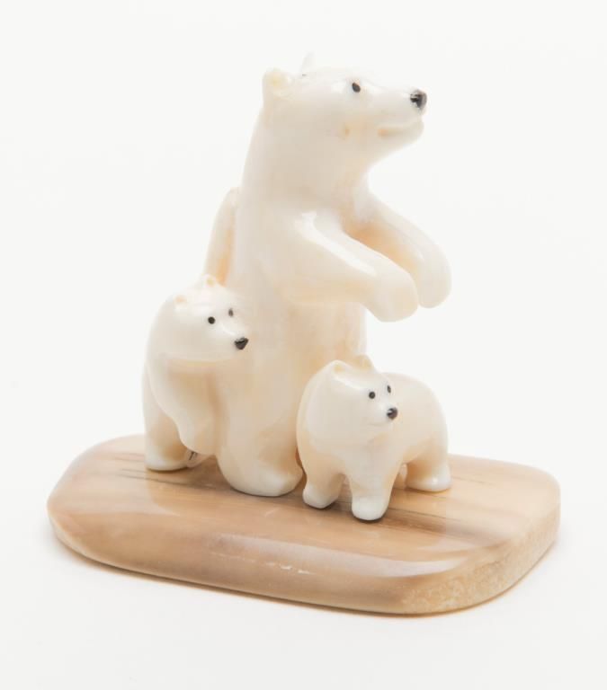 Polar Bears carved in Walrus ivory, approx. 2-1/2” tall with fossilized ivory base. Est.: $150-$300.