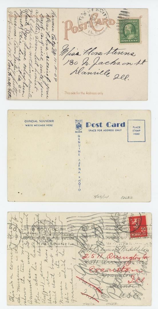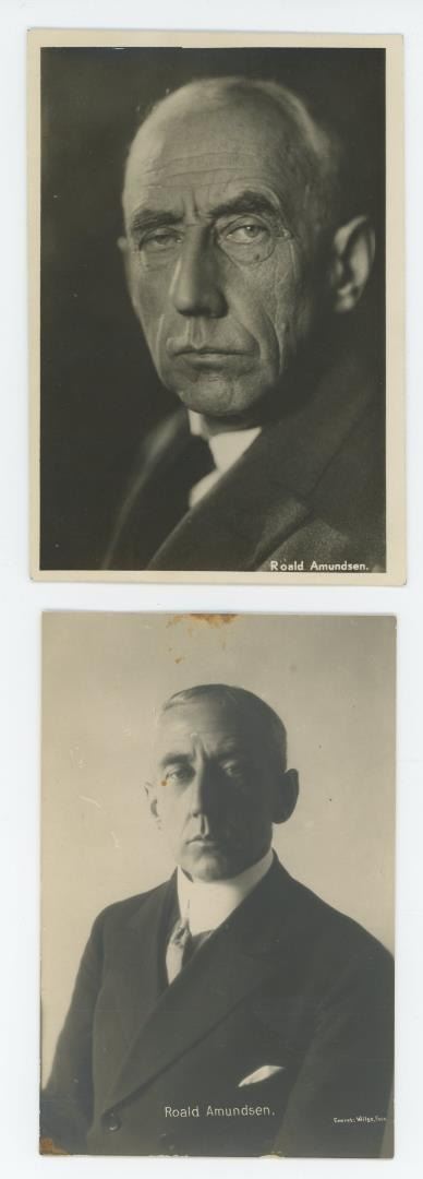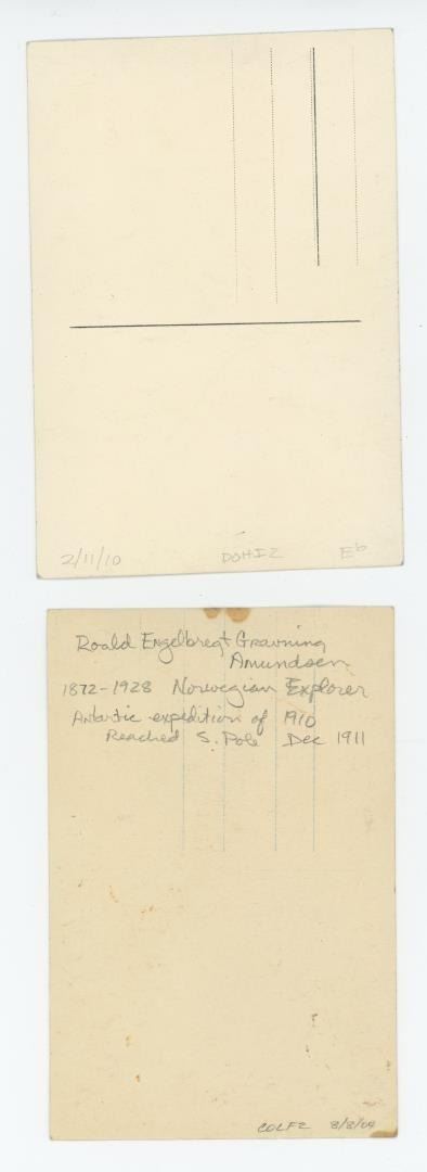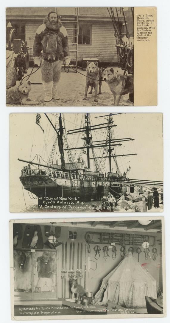 Collection of historical postcards featuring famous polar explorers and their vessels. Shows Robert E. Peary and Roald Amundsen. Shows the City of New York: Admiral Richard E. Byrd's ship, featured at the 1933 Century of Progress World's Fair in Chicago.