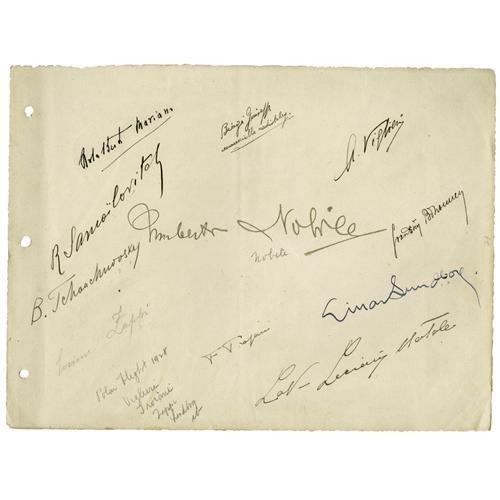 <B> Polar Flight 1928 Crew Signatures. </B></I> The signatures appear on an 11.5" x 8.5" sheet, with Nobile's signature in the very center, surrounded by the autographs of his entire nine man crew. Nobile's 1928 flight over the North Pole was historic, not only in its accomplishment, but also in the rescue that took place when he and his crew crashed. The rescue was a multi-national effort and Nobile and the crew of his airship were eventually rescued. Aside from Nobile, the crewmembers' signatures on the card include such names as Zappi, Lundborg, and Marian. An interesting lot; one which includes triumph and tragedy all in one. <r The signature sheet is in very fine condition; slight mounting traces on the verso; edges slightly worn. From the Henry E. Luhrs Collection. Accompanied by LOA from PSA/DNA.