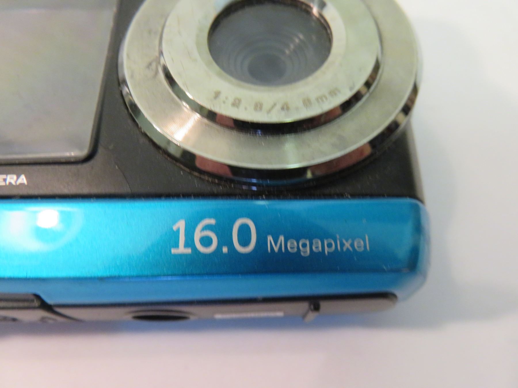16 megapixel. Takes AAA batteries. Uses Micro SD Card