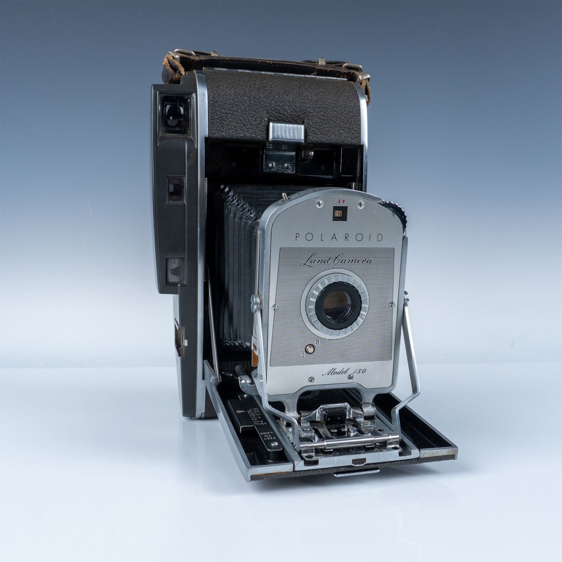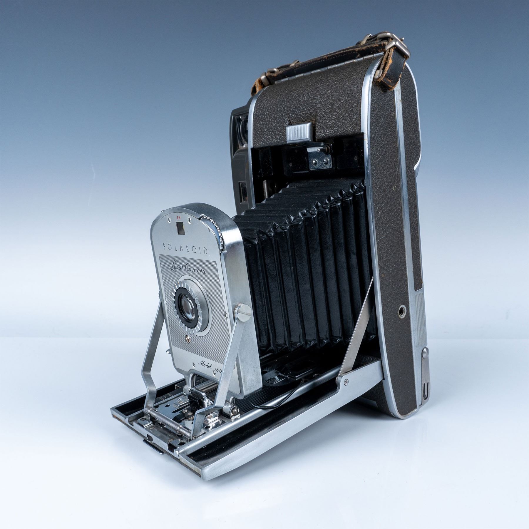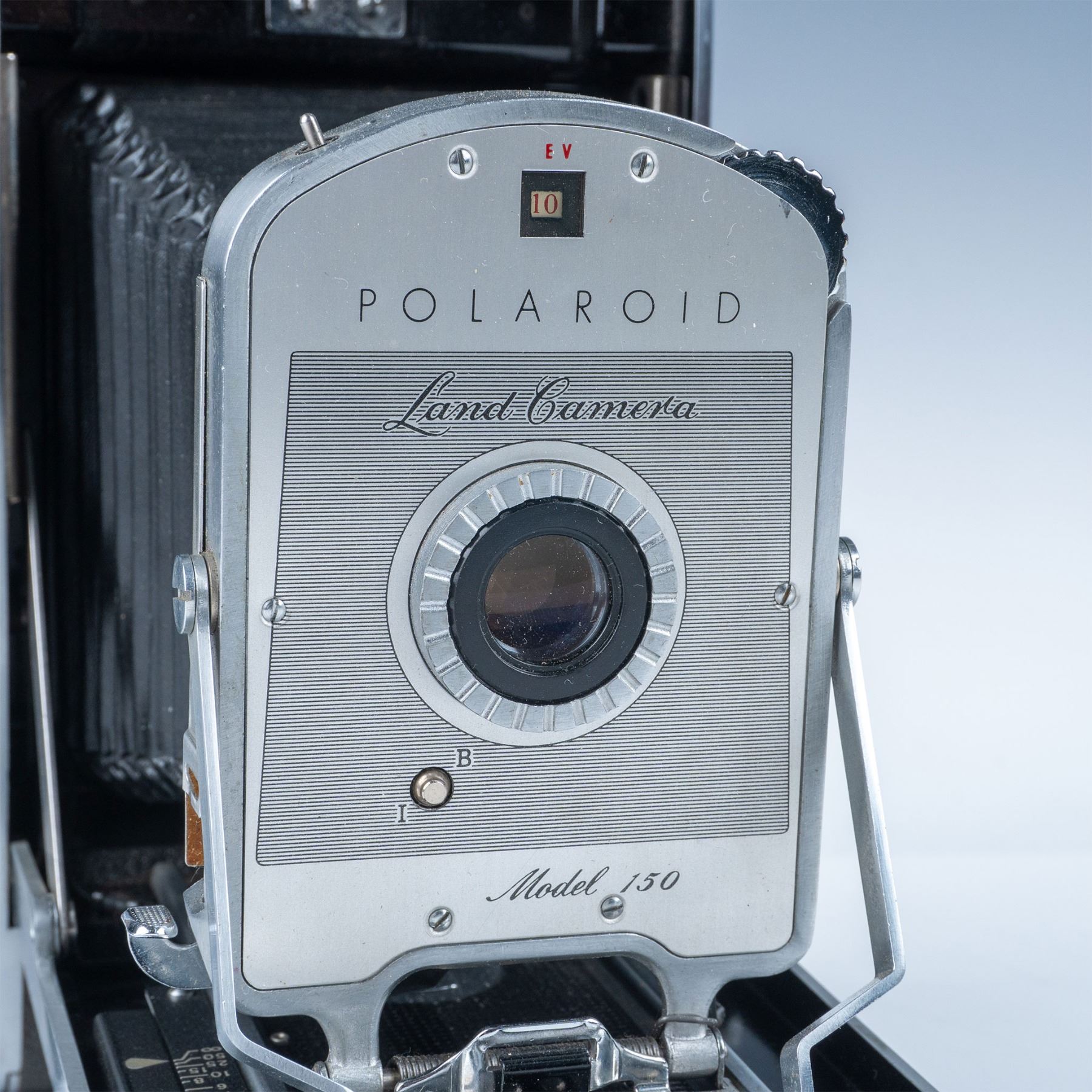 A premium instant camera introduced by Polaroid in the 1950s. Known for its advanced design, the Model 150 features a metal body wrapped in leatherette, a bellows system for focusing, and a sophisticated 3-element lens. It was part of Polaroid’s professional-grade line, designed to use Type 42 film and produce sharp black-and-white photographs.