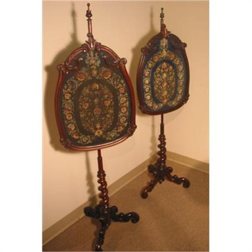 Excellent PAIR of mahogany English Victorian fireside Pole Screens. 59ins high 17ins wide. Identical frames, different color embroidery backgrounds (same pattern) One dark blue, one charcoal. Barley twist tripod stands, acanthus leaf theme on top. Beautiful patina. Screens slide up and down the pole to adjust to the heat from the fire. Unsed for Ladies when sitting in front of the fire to screen their face to protect their complexions. RARE PAIR c. 1860