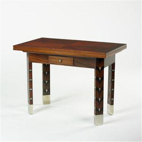 Top unfolds; fully extended table measures 44 inches. Information on this lot can be found at the archives of the Museum of Applied Arts in Budapest, Hungary. Stamped to underside: [Ellenorzes Mozeum Kiviteli Iparmuveszeti].<BR><BR>Condition of the item is not included in this description. Condition reports are available from Wright upon request. Wright strongly recommends that you review a condition report for each item on which you plan to bid.