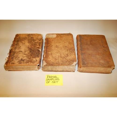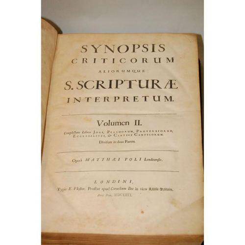 Poli, Matthaei [Poole, Matthew]. Synopsis Criticorum Aliorumque S. Scripturae Interpretum - 4 Volumes in 5. Londini [London]: J. Flesher & T. Roycroft, First Edition. Elephant Folio - over 15" - 23" tall. Hard Cover. Ex-Library. Fair Condition. 1669-1676. SCRIPTURE SYNOPSIS IN LATIN. Text in double column format, leather bindings (suede on volumes 1-2), raised bands on spines, marbled page edges (on volumes 3-5), leather spine labels (on volumes 2-4). Some covers detached, covers worn, interior foxing, occasional edge damp mark, one inner joint split. ALONG WITH - Volumes 4 & 5 of the Frankfurt Edition, dated 1678-1679, bound in vellum, with binding & hines tight. ALTOGETHER 7 VOLUMES.