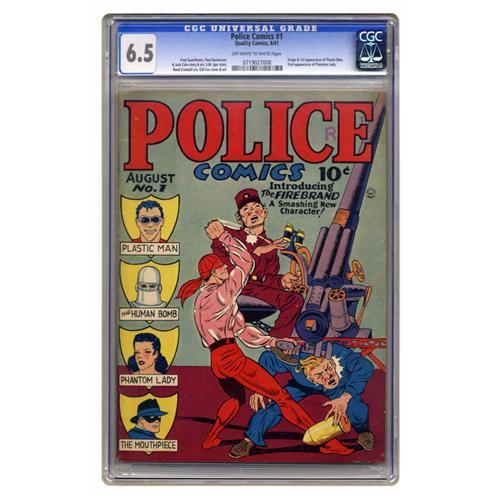 <B>Police Comics #1 (Quality, 1941) CGC FN+ 6.5 Off-white to white pages.</B></I> A mere two copies of this key issue have been certified with higher grades by CGC to date! This is the first appearance of Plastic Man, Jack Cole's elastic crimefighter who still has a following today. The origin story of how onetime criminal Eel O'Brian became Plas is told here. Also making her first appearance is Phantom Lady -- yes, she's the same character who later appeared in her own Fox Features title, though she has much more fabric on her costume here than later. The issue also has an unsigned story by the late Will Eisner, featuring a reporter named Chic Carter, who becomes "The Sword" when trouble arises. The hero who Quality <I>thought</B></I> would be the breakout star, Firebrand, stars in an entertaining tale drawn by Reed Crandall and is also seen on the Gill Fox cover. Overstreet 2005 FN 6.0 value = $2,226; VF 8.0 value = $5,194. CGC census 12/05: 2 in 6.5, 2 higher.