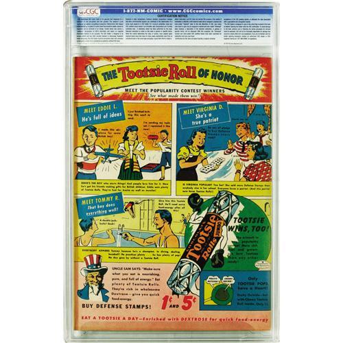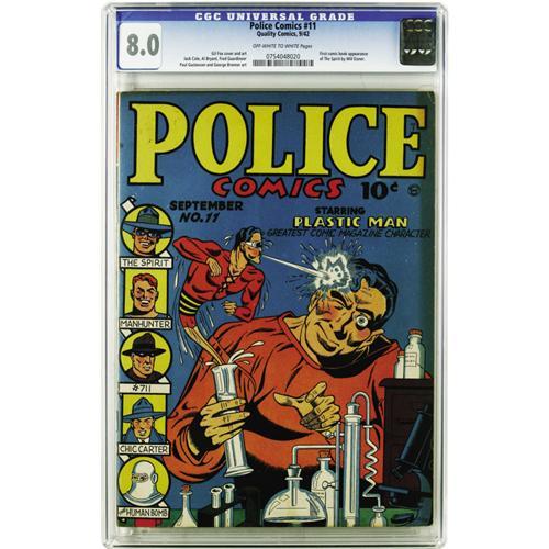 <B>Police Comics #11 (Quality, 1942) CGC VF 8.0 Off-white to white pages.</B></I> Here's a stumper for your comic-collecting friends: what's the first comic <I>book</B></I> appearance of the Spirit? Yes, it's this issue right here, and the vignette with his masked face is the first time the character was seen on a cover. The story reprints Will Eisner's very first Spirit newspaper section. Of course, Jack Cole's Plastic Man appears in these pages too, as does Arthur Peddy's Phantom Lady. Overstreet 2006 VF 8.0 value = $1,481. CGC census 2/06: 3 in 8.0, 3 higher. <I>From the Collection of Harold Curtis.</B></I>