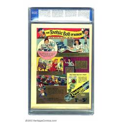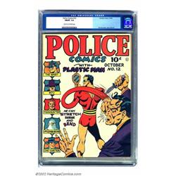 Police Comics #12 (Quality, 1942) CGC FN/VF 7.0 Cream to off-white pages. Gill Fox created the early issue covers on this title's run, and Jack Cole must have been noticing. Mr. Cole, who contributed interior art on these same early issues, would later take over the cover art duties and raise the bar with his outstanding Plastic Man renditions. A top corner cover crease keeps this one from being Very Fine, or perhaps even approaching Near Mint. Even so, this is the finest copy CGC has yet seen. Overstreet 2002 FN 6.0 value = $395; VF 8.0 value = $825. Important notice: We expect to be auctioning lots at the rate of 200-250 per hour. Sometimes eBay Premier live bid software cannot keep up with that pace, so we strongly recommend that you place a realistic proxy bid now as insurance to avoid disappointment. Also please note that all Heritage/CAA lots purchased through eBay Premier carry a 20% Buyer's Premium. Please make sure you read the Terms and Conditions.