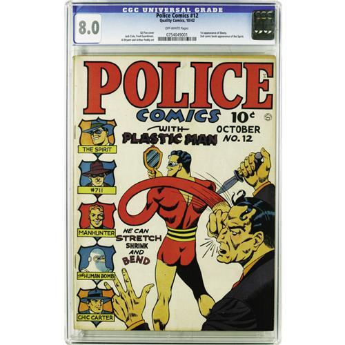 <B>Police Comics #12 (Quality, 1942) CGC VF 8.0 Off-white pages.</B></I> This issue has the first comic book appearance of the Spirit's sidekick Ebony. Also appearing is Plastic Man, drawn by Gill Fox on the cover and Jack Cole inside the book. Phantom Lady also appears. Overstreet 2006 VF 8.0 value = $856. CGC census 3/06: 1 in 8.0, none higher. <I>From the Collection of Harold Curtis.</B></I>