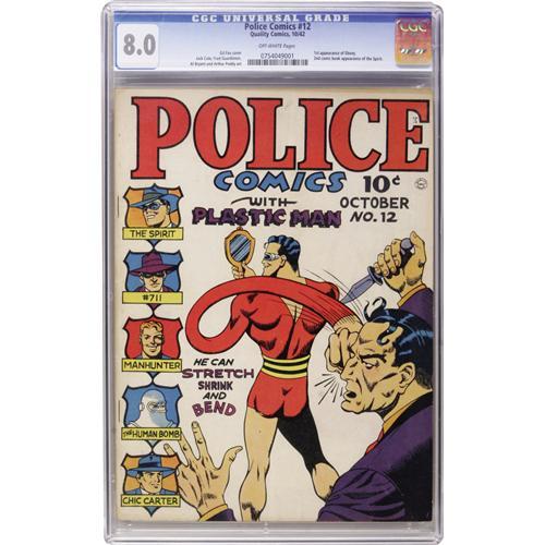 <B>Police Comics #12 (Quality, 1942) CGC VF 8.0 Off-white pages.</B></I> This issue has the first comic book appearance of the Spirit's sidekick Ebony. Also appearing is Plastic Man, drawn by Gill Fox on the cover and Jack Cole inside the book. Phantom Lady also appears. Overstreet 2006 VF 8.0 value = $856. CGC census 3/07: 1 in 8.0, none higher.<BR><BR><b>Shipping:</b> Comics - Slabbed (certified) (<a target="_blank" href="http://www.heritageauctions.com/common/shipping.php">view shipping information</a>)