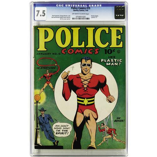 <B>Police Comics #15 (Quality, 1943) CGC VF- 7.5 Off-white to white pages.</B></I> Plastic Man (drawn by Gill Fox on the cover and Jack Cole inside) was the star of this series, of course, but such big names as the Spirit and Phantom Lady also appear in these pages. There's also a changing of the guard in one backup feature: 711 (DA turned prisoner who sneaks out of prison whenever he chooses in order to fight crime) is murdered, in a story which sees Destiny make his first appearance. The latter became a regular in this series for the next 20 issues or so. Overstreet 2006 VF 8.0 value = $600. CGC census 2/06: 1 in 7.5, 3 higher. <I>From the Collection of Harold Curtis.</B></I>