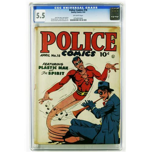 <B>Police Comics #18 (Quality, 1943) CGC FN- 5.5 Off-white pages.</B></I> Jack Cole cover. Plastic Man, the Spirit, and Phantom Lady appear. Overstreet 2006 FN 6.0 value = $288. CGC census 3/06: 1 in 5.5, none higher. <I>From the Collection of Harold Curtis.</B></I>
