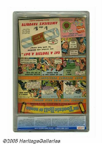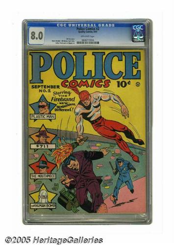 <B>Police Comics #2 (Quality, 1941) CGC VF 8.0 Off-white pages.</B></I> Here, as in issue #1, it's quite obvious that Firebrand was meant to be the star of this title, and he not only took center stage on this cover by Gill Fox, but got the VIP treatment inside the issue by being drawn by Reed Crandall. But of course, the real star in the making was Jack Cole's Plastic Man. Overstreet notes, "Plastic Man smuggles opium"... true enough, but he only does it undercover to help bust an opium ring, so give him a break! Plas joins the police for the first time in this issue. Also of note is the second appearance of Phantom Lady. Overstreet 2005 VF 8.0 value = $2,061. CGC census 4/05: 1 in 8.0, 2 higher.