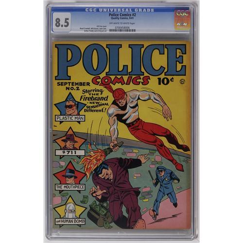 <B>Police Comics #2 (Quality, 1941) CGC VF+ 8.5 Off-white to white pages.</B></I> Plastic Man smuggles opium in this issue... don't panic, Plas does it <I>undercover</B></I> to help bust the smugglers! Our favorite India Rubber Man hadn't quite emerged as the star of the title yet, that honor went to Firebrand, who was drawn on the cover by Gill Fox and inside the issue by Reed Crandall. Also of note is the second appearance of Phantom Lady. Overstreet 2006 VF 8.0 value = $2,015; VF/NM 9.0 value = $3,408. CGC census 3/06: 2 in 8.5, 1 higher.