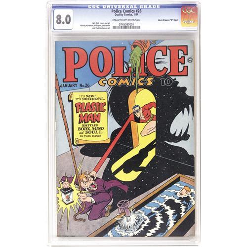 <B>Police Comics #26 Davis Crippen ("D" Copy) pedigree (Quality, 1944) CGC VF 8.0 Cream to off-white pages.</B></I> We were already thrilling to Jack Cole's dramatic use of lighting on this cover. Then we noticed the girl. Then we noticed the acid! Also noteworthy is that three great creators had a hand in the book, with Cole's Plastic Man joined by Will Eisner's Spirit as well as a six-pager featuring Harvey Kurtzman's Flatfoot Burns. Overstreet 2006 VF 8.0 value = $488. CGC census 6/06: 1 in 8.0, 2 higher. <I>From the Crippen Collection.</B></I> <BR><BR><B>Important notice:</B> Heritage usually auctions material at the rate of 200-250 lots per hour. On some occasions eBay Live bid software or the Internet may not be able to keep up with the pace of the auction. We recommend placing a realistic absentee bid now as insurance to avoid disappointment. Occasionally the auctioneer may eliminate or reject an eBay Live bid, and the auctioneer may also reopen a lot after the close of the eBay live bidding (usually because we missed an audience bid), and may reject your bid even if it shows you as the winning bidder. By bidding via eBay Live, you agree that Heritage may award the lot to another bidder at its sole discretion under the circumstances described above or any other reasonable circumstances. Since eBay bids are not shown to us until we open the lot on the floor, we treat those bids just like floor bids. In most cases the floor responds before the eBay bid is presented to us, due to Internet lag time, so for consistency we have made it a policy that floor bids are always considered first over tie eBay live bids. Also please note that all Heritage lots purchased through eBay Live carry a 22.5% Buyer's Premium. Please make sure you read the Terms and Conditions before you bid. This lot is being auctioned in conjunction with a live floor auction by Heritage Auction Galleries. All final auction and invoice information will be supplied by Heritage Auction Galleries, and all other information should be considered preliminary. Lot:41001 <BR><BR><B>Winning Notification and Billing:</B> After the FINAL session in this auction is complete, Heritage will send e-mail and snail mail invoices. This process normally takes several days. All final auction and invoice information will be supplied by Heritage Auction Galleries, and all other information should be considered preliminary. <BR><BR>This auction will be conducted on a live auction floor and over the Internet through eBay Live. If you choose to place an absentee bid, please take a moment to <font color='#0000ff'><u><a href='http://pages.ebay.com/liveauctions/help/before/laabsentee.html'>learn how eBay Live absentee bidding works</a></u></font><font color='#000000'>