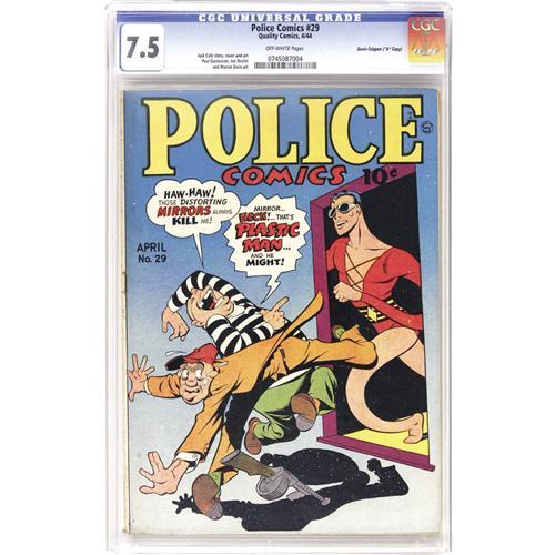 <B>Police Comics #29 Davis Crippen ("D" Copy) pedigree (Quality, 1944) CGC VF- 7.5 Off-white pages.</B></I> Plastic Man is joined by Will Eisner's Spirit, the Human Bomb, and many other heroes in this issue. The cover is credited to Plas' creator Jack Cole. Overstreet 2006 VF 8.0 value = $488. CGC census 6/06: 1 in 7.5, 4 higher. <I>From the Crippen Collection.</B></I> <BR><BR><B>Important notice:</B> Heritage usually auctions material at the rate of 200-250 lots per hour. On some occasions eBay Live bid software or the Internet may not be able to keep up with the pace of the auction. We recommend placing a realistic absentee bid now as insurance to avoid disappointment. Occasionally the auctioneer may eliminate or reject an eBay Live bid, and the auctioneer may also reopen a lot after the close of the eBay live bidding (usually because we missed an audience bid), and may reject your bid even if it shows you as the winning bidder. By bidding via eBay Live, you agree that Heritage may award the lot to another bidder at its sole discretion under the circumstances described above or any other reasonable circumstances. Since eBay bids are not shown to us until we open the lot on the floor, we treat those bids just like floor bids. In most cases the floor responds before the eBay bid is presented to us, due to Internet lag time, so for consistency we have made it a policy that floor bids are always considered first over tie eBay live bids. Also please note that all Heritage lots purchased through eBay Live carry a 22.5% Buyer's Premium. Please make sure you read the Terms and Conditions before you bid. This lot is being auctioned in conjunction with a live floor auction by Heritage Auction Galleries. All final auction and invoice information will be supplied by Heritage Auction Galleries, and all other information should be considered preliminary. Lot:41001 <BR><BR><B>Winning Notification and Billing:</B> After the FINAL session in this auction is complete, Heritage will send e-mail and snail mail invoices. This process normally takes several days. All final auction and invoice information will be supplied by Heritage Auction Galleries, and all other information should be considered preliminary. <BR><BR>This auction will be conducted on a live auction floor and over the Internet through eBay Live. If you choose to place an absentee bid, please take a moment to <font color='#0000ff'><u><a href='http://pages.ebay.com/liveauctions/help/before/laabsentee.html'>learn how eBay Live absentee bidding works</a></u></font><font color='#000000'>