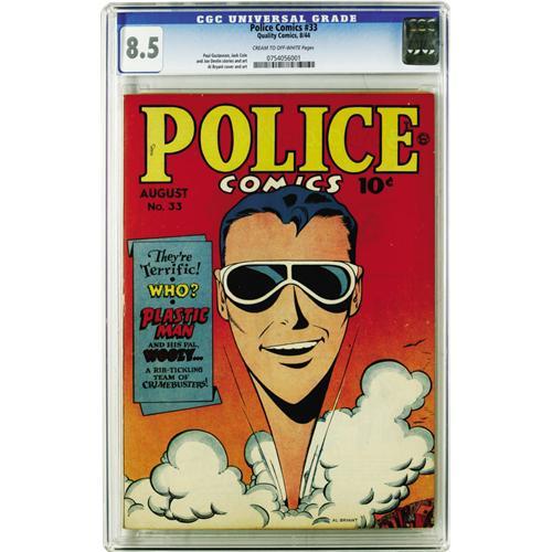 <B>Police Comics #33 (Quality, 1944) CGC VF+ 8.5 Cream to off-white pages.</B></I> Here's the highest-graded copy of this issue yet certified, and it's got Plastic Man and the Spirit! What more do you need to know? Overstreet 2006 VF 8.0 value = $329; VF/NM 9.0 value = $515. CGC census 2/06: 1 in 8.5, none higher. <I>From the Collection of Harold Curtis.</B></I>
