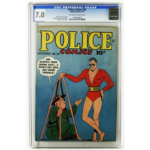 <B>Police Comics #34 (Quality, 1944) CGC FN/VF 7.0 Off-white to white pages.</B></I> Jack Cole art. Al Bryant cover. Overstreet 2006 FN 6.0 value = $162; VF 8.0 value = $329. CGC census 2/06: 1 in 7.0, 1 higher. <I>From the Collection of Harold Curtis.</B></I>